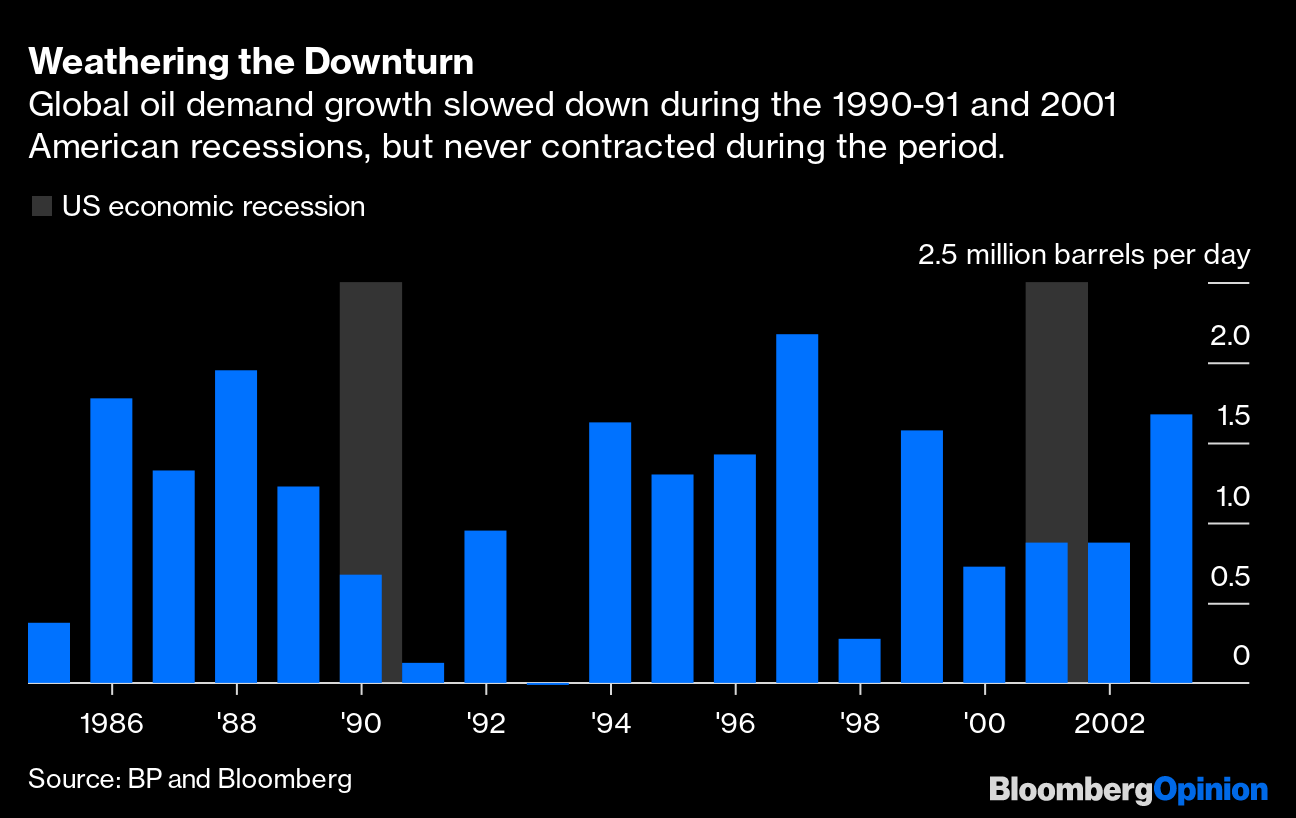 Macro hedge funds are already betting that oil demand will crash and prices will drop. Yet the bears may be catastrophizing the true impact of a recession. A review of how oil demand responded to a cooling American economy three decades ago can explain why an economic slowdown today might not be too terrible, and how oil prices can stay higher than many expect.