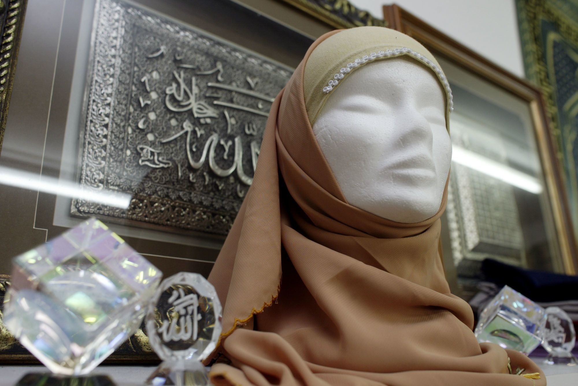 A headscarf is displayed in a store in Paris, France. (Photographer: Lucas Schifres/Bloomberg News)