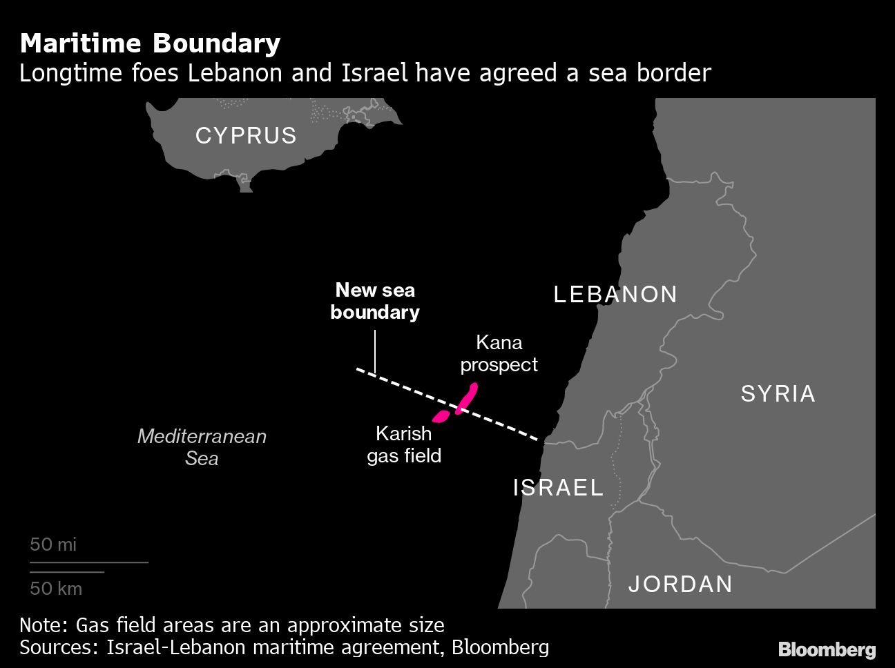 Now that the countries have agreed a maritime border, a TotalEnergies SE-led consortium will be able to start drilling in the Kana prospect, most of which lies in Lebanese territory. If gas is produced, both countries would be entitled to payments.