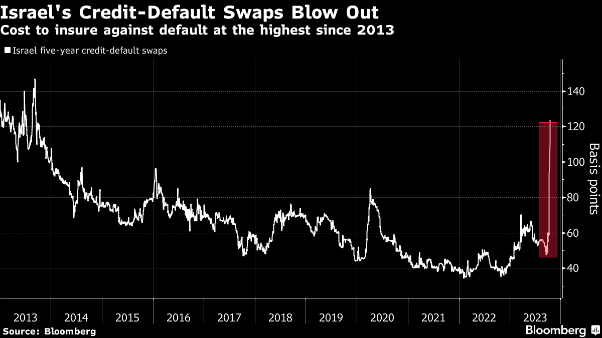 Israel's sovereign debt is trading like it's been cut already as investors factor in the impact of a protracted war. The cost to insure its bonds against potential default has spiked by about 70 basis points since attacks by Hamas.