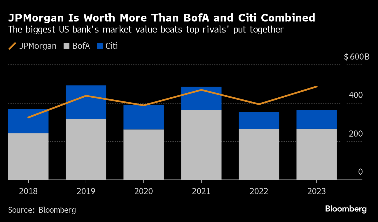 As Dimon, 67, extends his tenure atop JPMorgan indefinitely, his firm is worth more than its two next-largest competitors put together. Its market value amounts to about 27% of the KBW Bank Index's total value. When he took the reins, that figure was 12%.