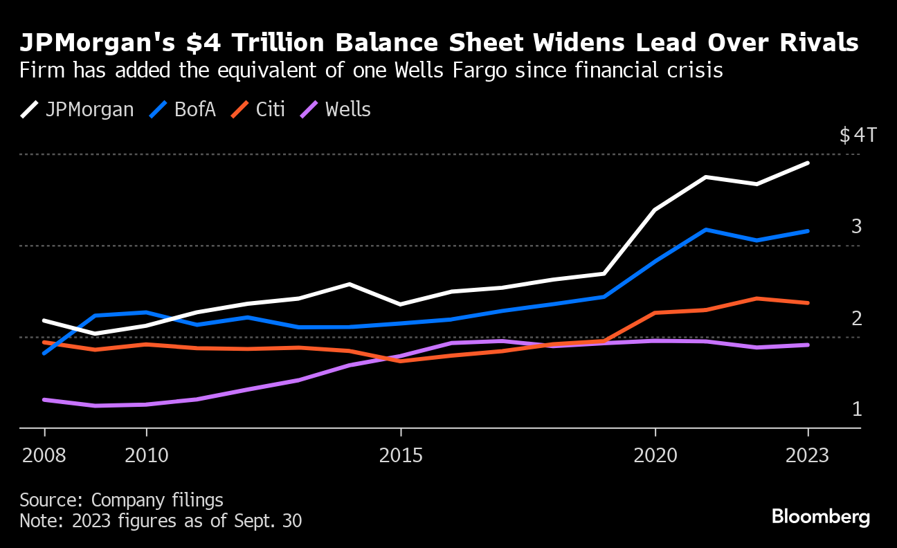 JPMorgan has emerged as the biggest of the big. Its next-largest competitors have also added waves of clients, but those rivals have been in less of a position to play offense. Bank of America Corp. is contending with a mountain of unrealized losses on low-interest assets that may drag on earnings for years, while Citigroup Inc. and Wells Fargo & Co. are shoring up internal controls to address regulators' concerns.