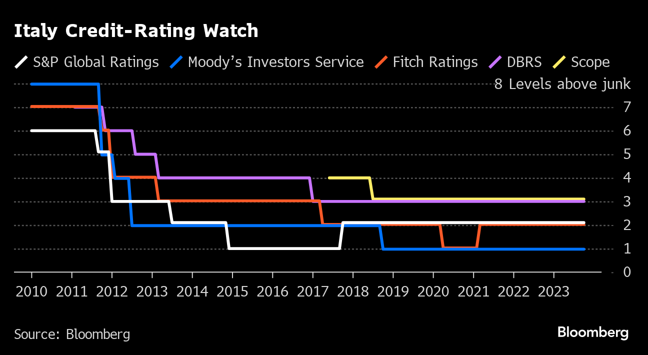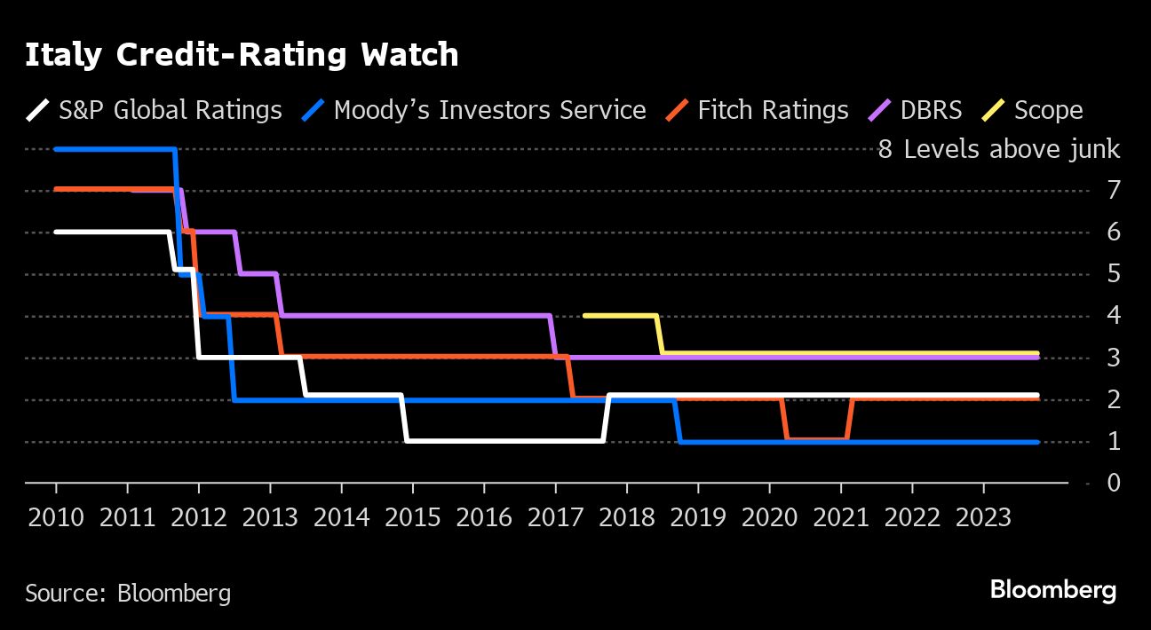 The company's scheduled update was the last in a series of such big assessments on Italy this year — and the most precarious, given its proximity to junk. Rivals have markedly more upbeat views, with both Fitch Ratings and S&P Global Ratings reaffirming stable investment-grade assessments one step higher.