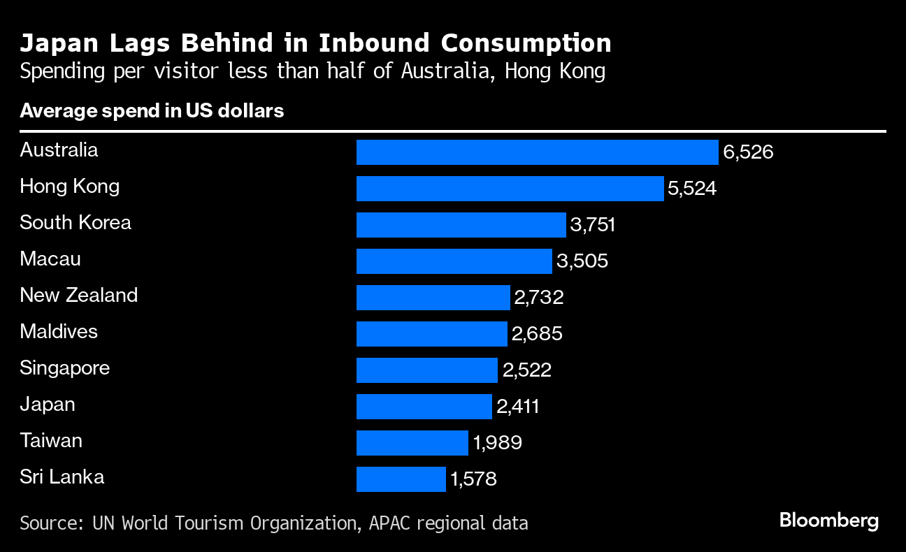 Despite the growth of consumption by tourists in Japan, the country still lags behind others in the region when it comes to total spending per visitor, which stood at $2,411 in 2022, according to the UN World Tourism Organization. That compares with $5,524 per tourist in Hong Kong and $6,526 in Australia, which stands at the top of the list.