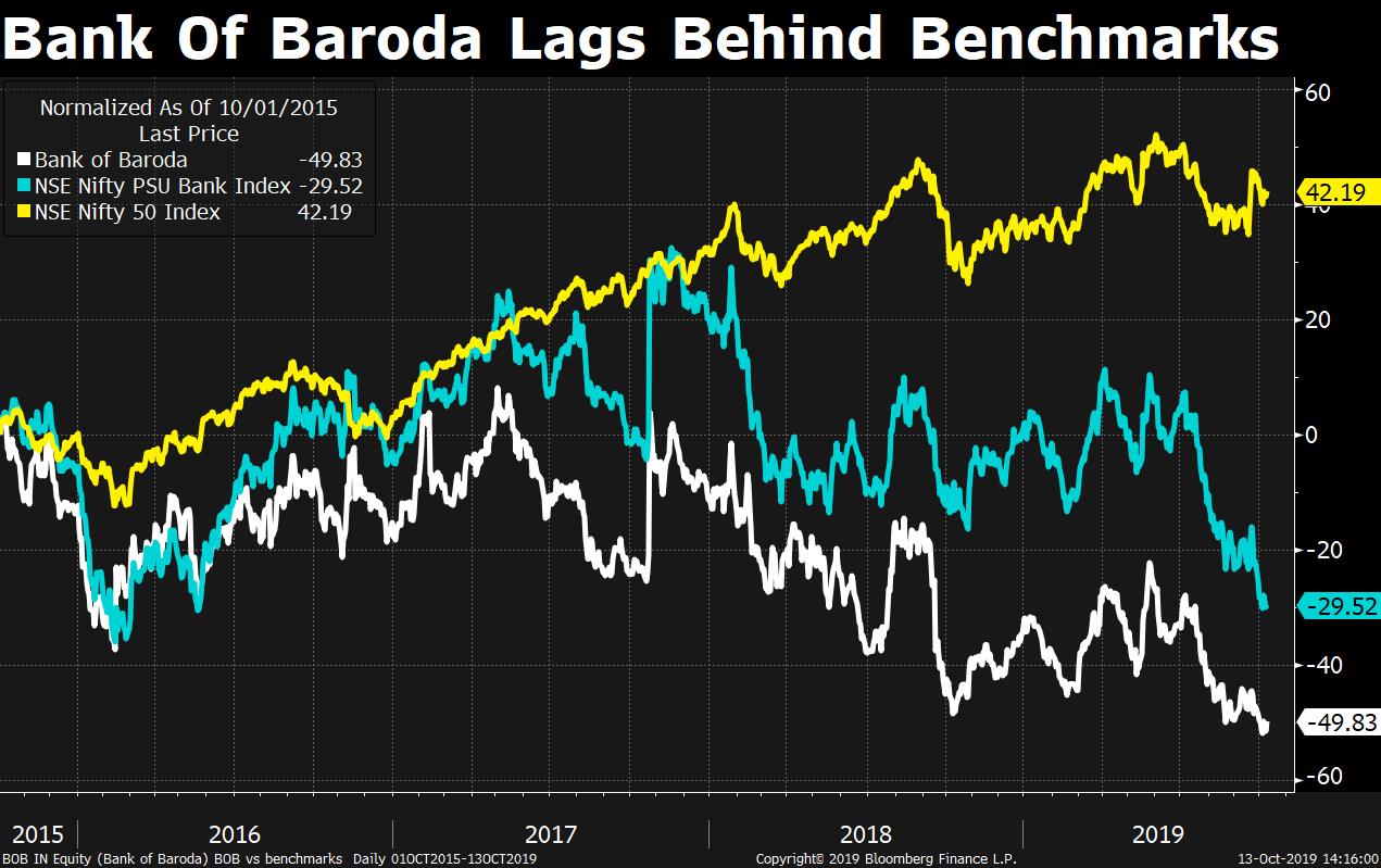 Bank of Baroda's performance on the stock markets, too, has been shaky. The series of challenges, including the year-old merger announcement, have meant that the bank has under-performed the broader markets.