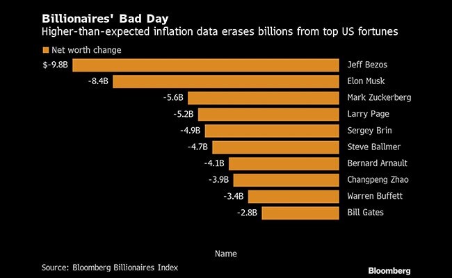 The fortunes of America's richest billionaires tumbled on Tuesday by $93 billion, the ninth-worst daily loss ever, as hotter-than-expected US inflation data roiled markets.