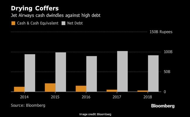 Mumbai-based Jet Airways had total debt of 94.3 billion rupees ($1.4 billion), and cash and equivalents of 3.2 billion rupees for the year ended March 31, 2018, according to Bloomberg-compiled data. The firm's total debt ballooned to 55.4 times earnings before interest and tax as of March 31, compared to 4.9 times the previous year, the data showed.