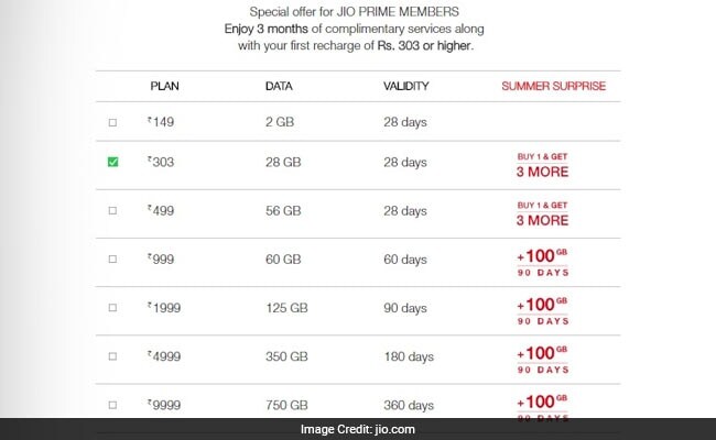 Under the Summer Surprise scheme, Jio prepaid customers subscribing to Prime are being offered complimentary benefits under various recharge packs. Jio's Prime members making their first paid recharge of Rs 303 plan (or any higher value plan) till April 15, 2017 will get three months of services on a complimentary basis. The paid tariff plan will be applied only in July, after the expiry of the complimentary offer. (Also read: Summer Surprise offer features, extra benefits)