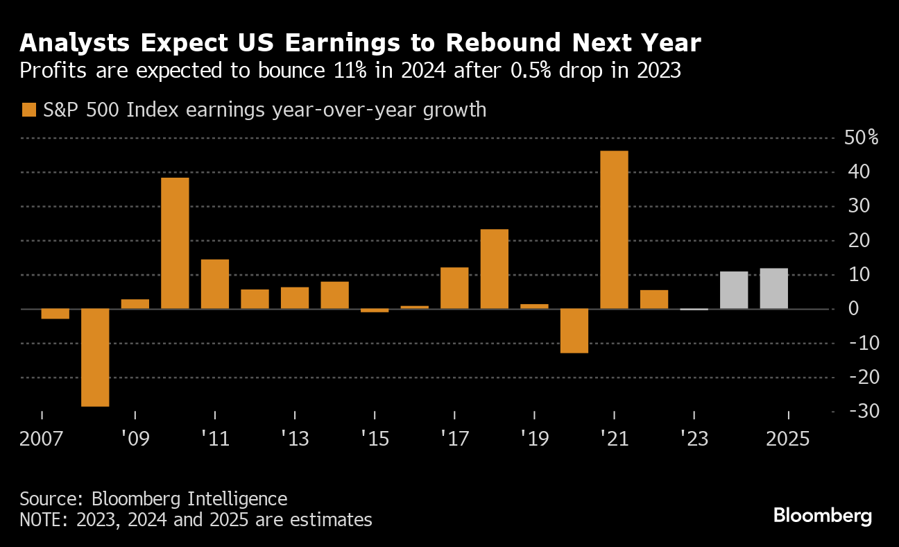For 2024, analysts expect an 11% rebound in earnings after a 0.5% drop for full-year 2023, the data show. However, risks to economic growth are piling up at a time when interest rates remain high, while bellwethers like Target Corp. and Walmart Inc. have flagged concerns about the health of the consumer — the engine that powers two-thirds of the US economy.
