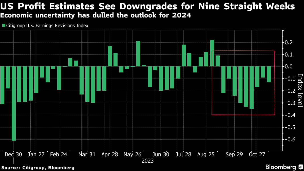 A Citigroup index shows downgrades to US earnings estimates have outnumbered upgrades for nine weeks in a row — the longest streak since February. Chronert — an equity strategist at the bank — does expect analysts' estimates for 2024 to drop in the coming quarter — but that would only lower the bar for companies, he said.