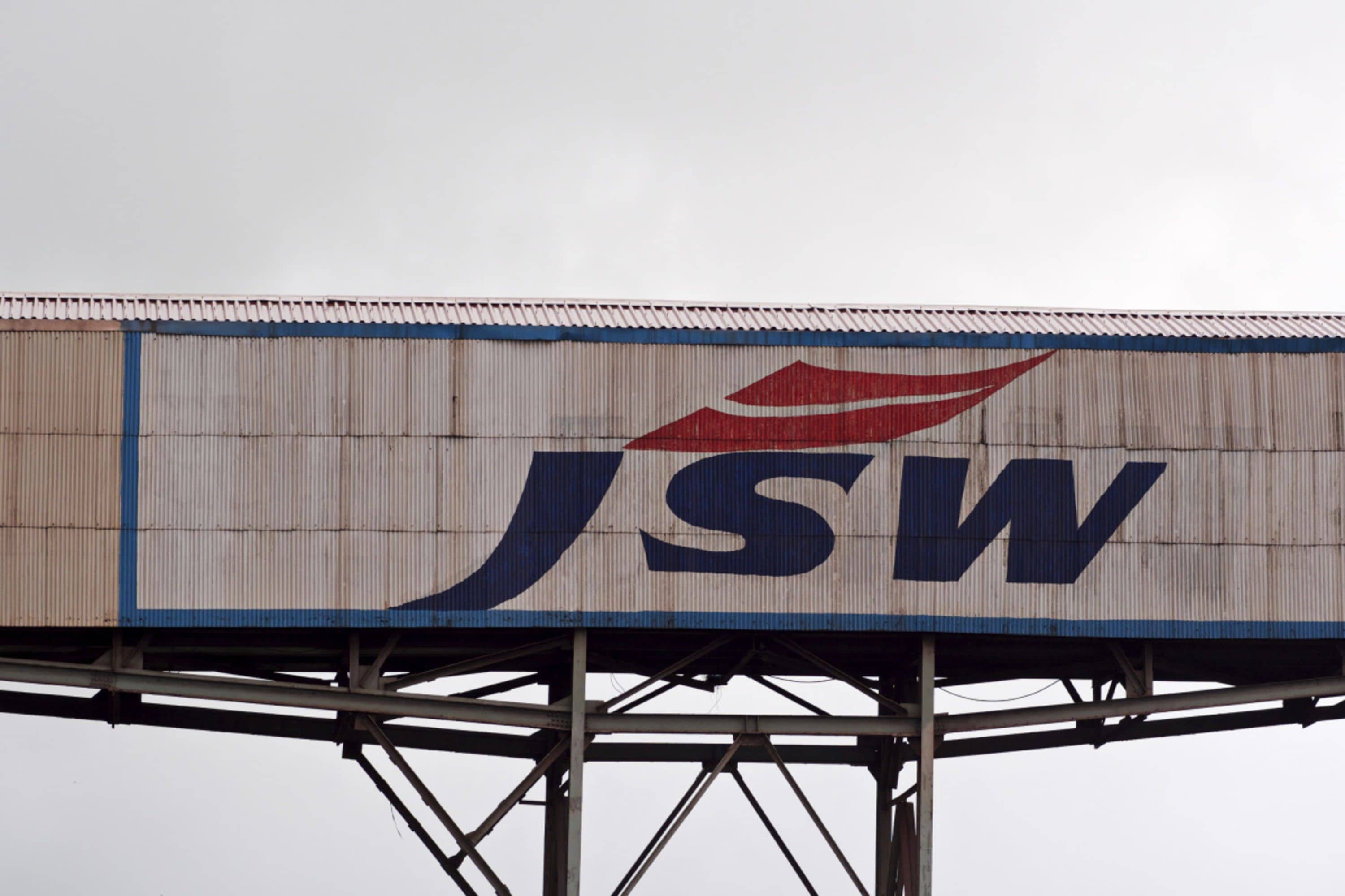 The JSW Steel Ltd. logo is displayed on an overhead conveyor at the company’s manufacturing facility in Dolvi, Maharashtra, India. (Photographer: Adeel Halim/Bloomberg)