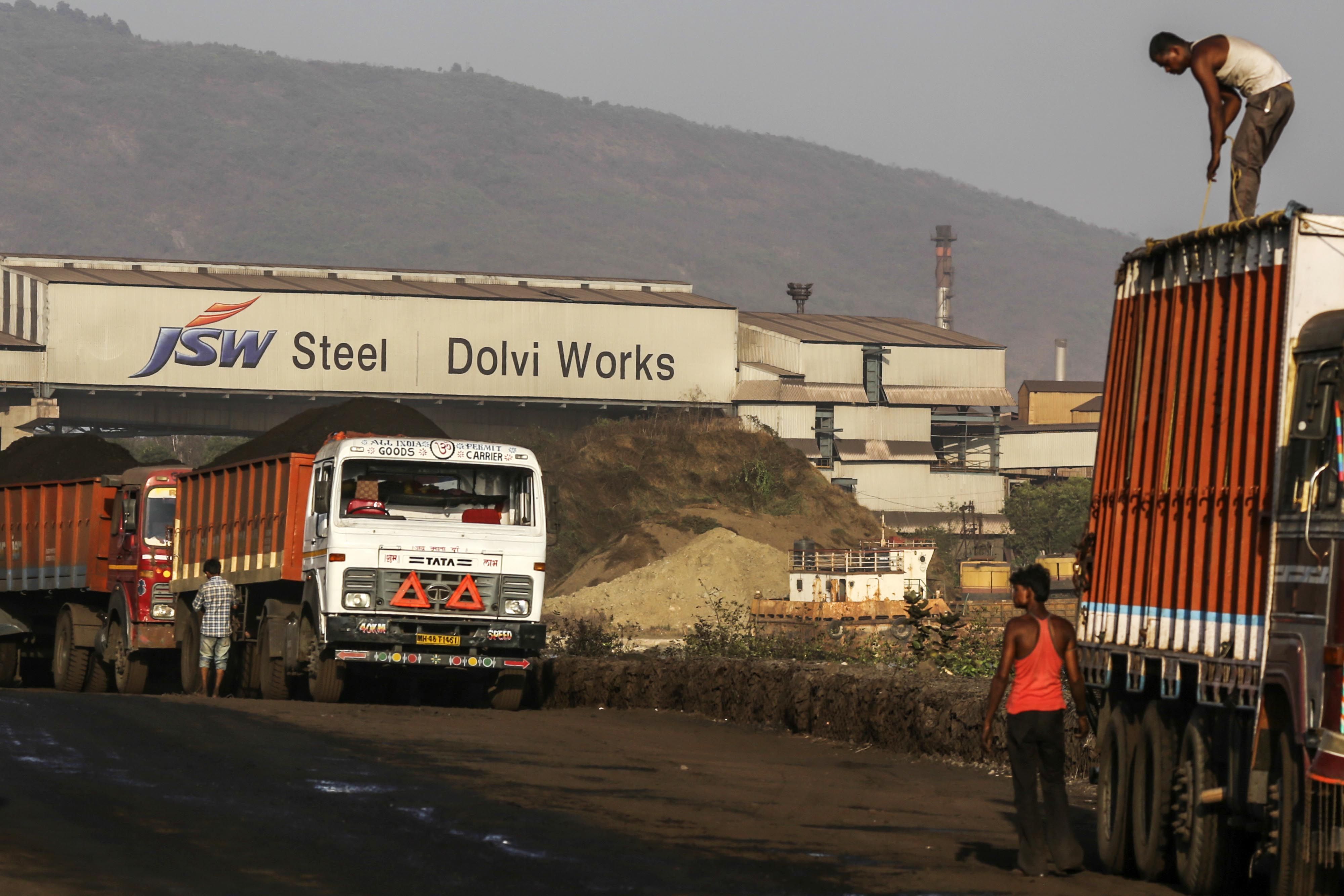 Trucks stand parked near the JSW Steel Ltd. manufacturing facility in Dolvi, Maharashtra, India. (Photographer: Dhiraj Singh/Bloomberg)