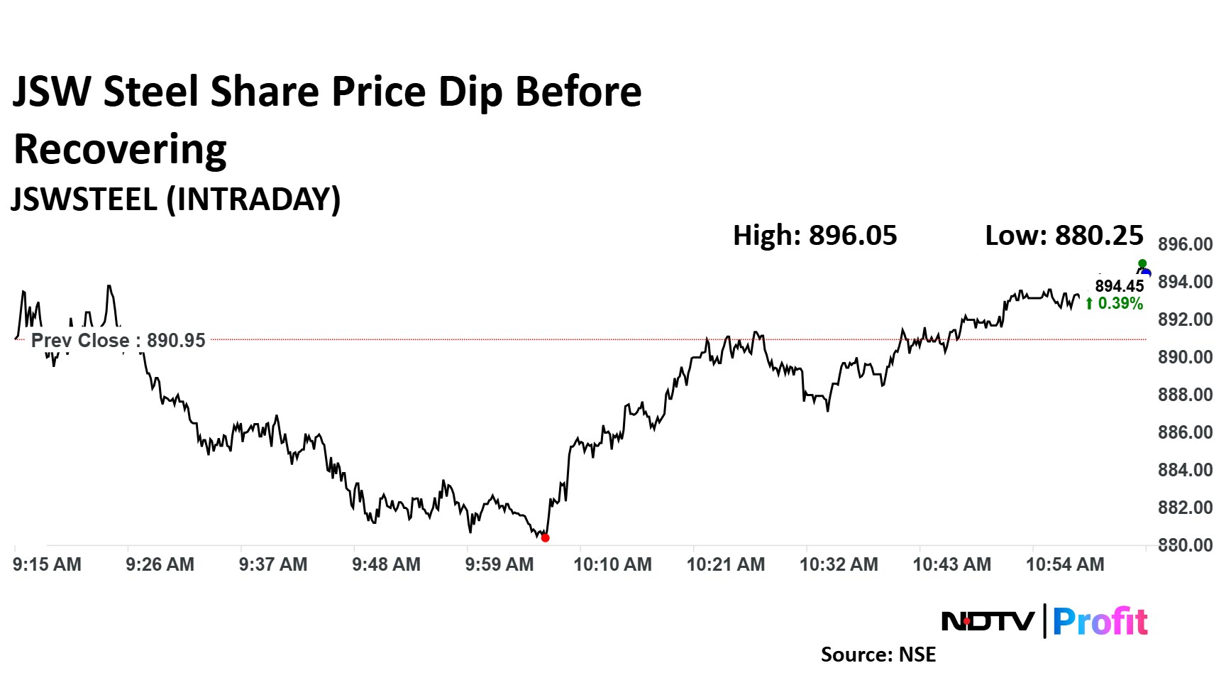 The scrip fell as much as 1.20% to Rs 880.25 apiece. It later recovered losses to trade 0.29% higher at Rs 893.50 apiece, as of 11:02 a.m. This compares to a 0.10% decline in the NSE Nifty 50.