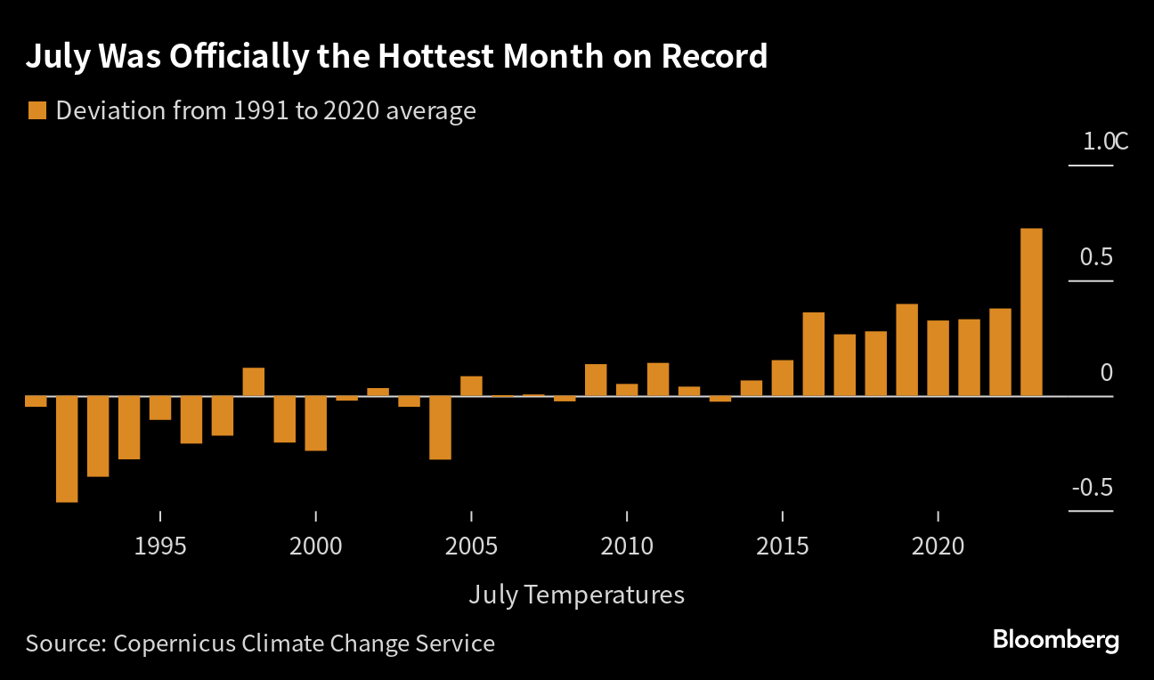 (Bloomberg) -- July was officially Earth's hottest month on record, causing the Antarctic to shrink at a record pace and the European Union's earth observation agency to warn of “dire consequences” as extreme weather events grow more frequent and more intense.