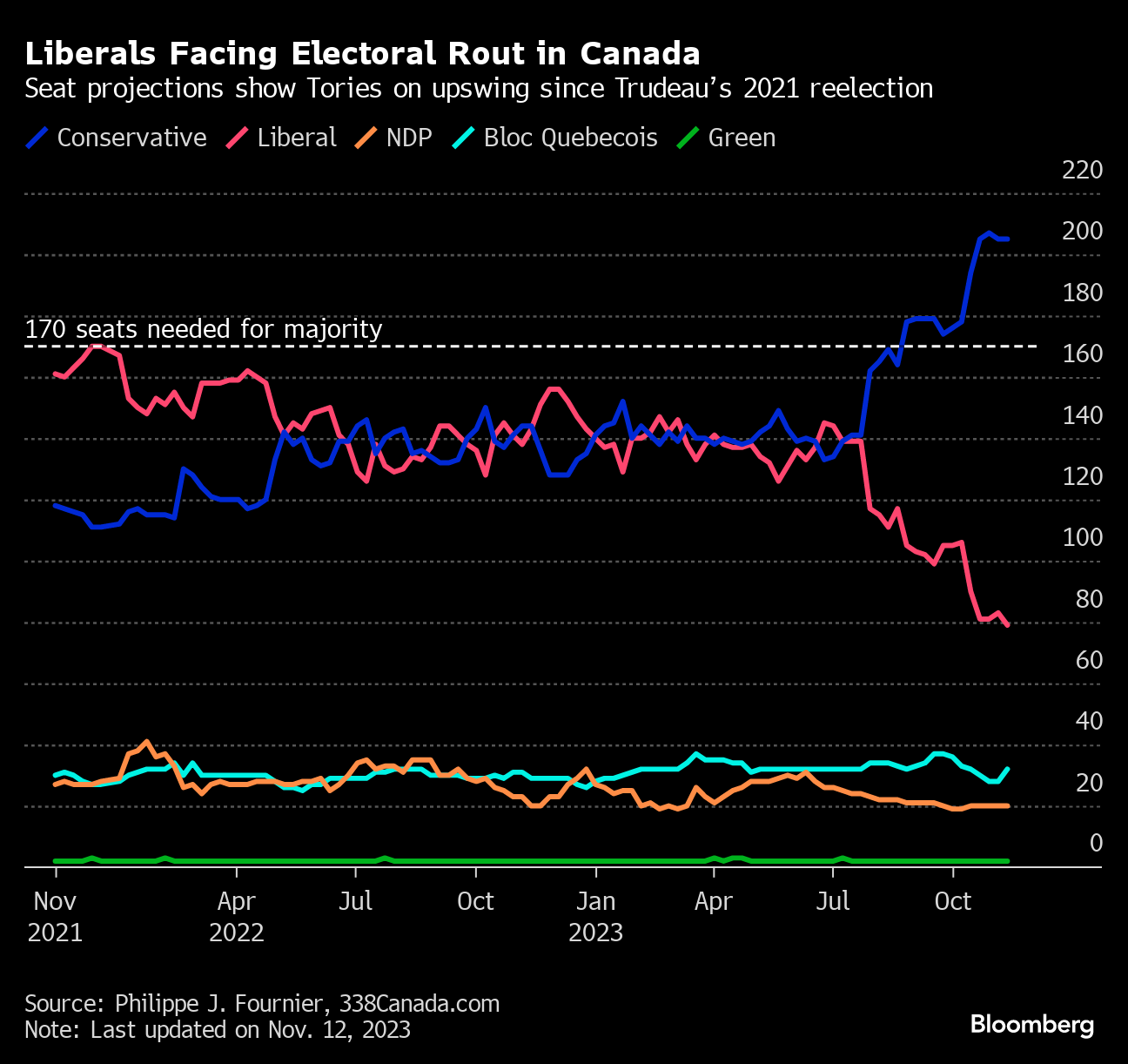 For months, polls have shown the Conservative Party, led by Pierre Poilievre, ahead by 10 to 15 points and gaining ground nearly everywhere. Those numbers, if they were to hold up in an election, would likely produce a large majority government for the 44-year-old opposition leader and end Trudeau's reign with a thud.