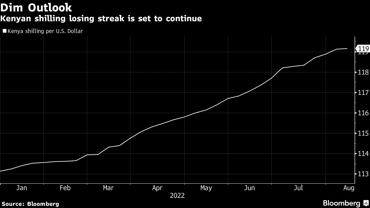The currency of East Africa's largest economy weakened to an all-time low of 119.68 per dollar, after falling for the 14th consecutive month in July, with the longest stretch of 30-day losses on record. It recouped some losses to trade at 119.17 shillings by 1 p.m. in Nairobi.