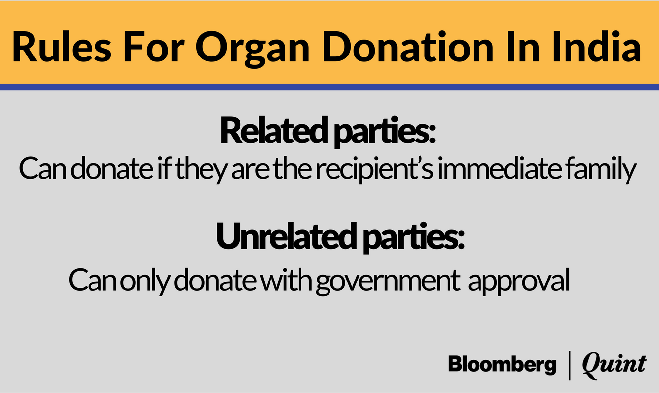 Under Indian law, unrelated persons can only donate kidneys for transplantations after receiving the government's approval. Related persons can do so if they are the recipient's immediate family.