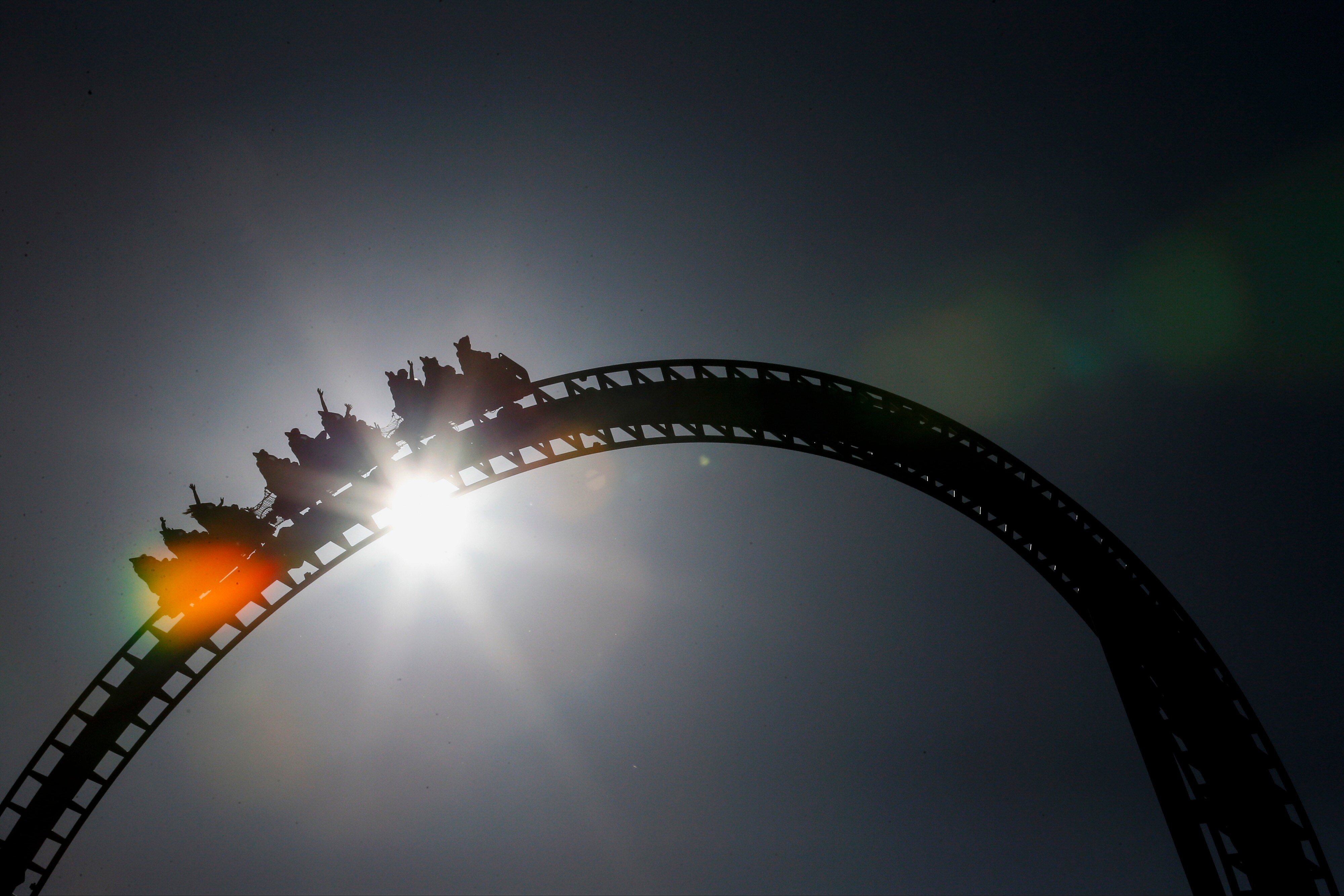 Visitors ride the Tatsu roller coaster at Six Flags Magic Mountain in Valencia, California, U.S. (Photographer: Patrick T. Fallon/Bloomberg)