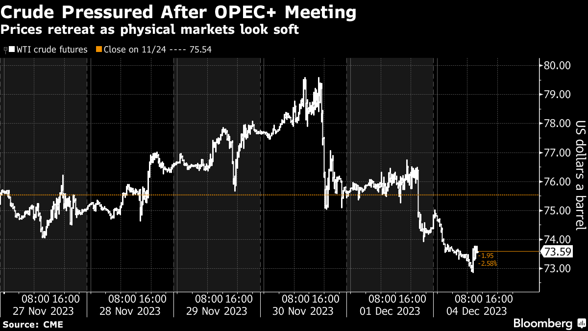 Oil just posted back-to-back monthly declines as supplies from non-OPEC countries ballooned, while the outlook for demand growth softened. A meeting of the Organization of Petroleum Exporting Countries and its allies last week saw delay and internal wrangling, causing some to doubt the group's pledged supply cuts. Prices have softened even as wider markets wager that the US Federal Reserve is done hiking interest rates.