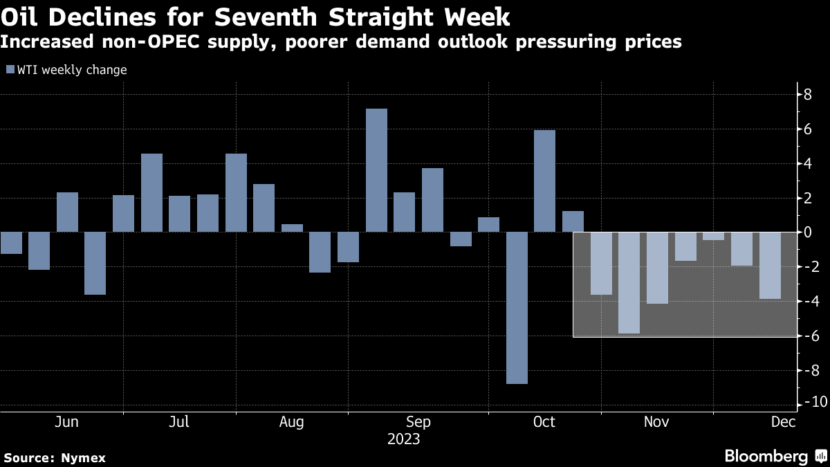 There are also concerns about the trajectory of demand. Chinese consumption is expected to grow by 500,000 barrels a day next year, according to a Bloomberg survey, less than a third of the increase seen in 2023. In the US, meanwhile, many economists see a recession starting next year.