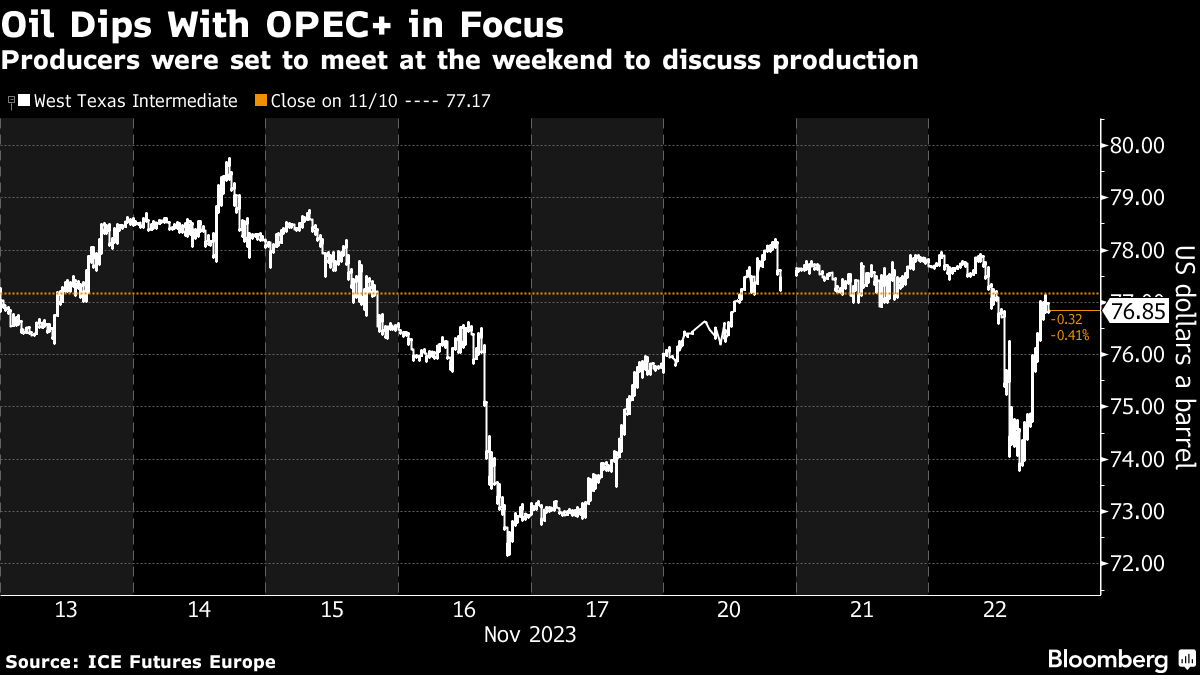 (Bloomberg) -- Oil fell as the OPEC+ meeting that had been set for the weekend was delayed, denting traders' expectations that the cartel will intervene to tighten supplies.