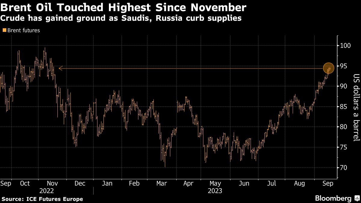 (Bloomberg) -- Oil rose toward $95 a barrel, extending a powerful surge that has been driven by resilient demand and supply curbs from OPEC+ leaders Saudi Arabia and Russia.