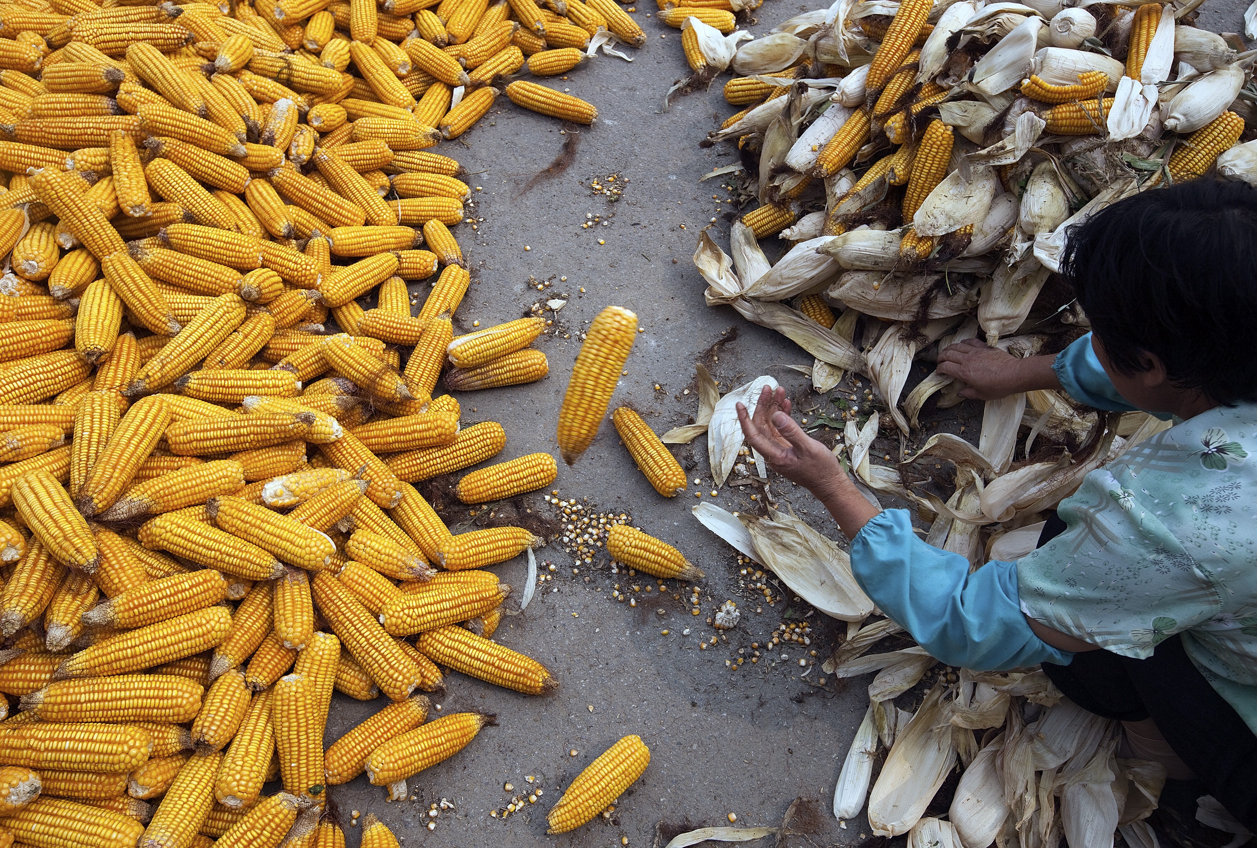A worker tosses an ear of corn after removing the husk in Beijing, China. (Photographer: Doug Kanter/Bloomberg)