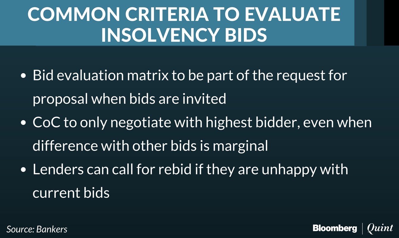 At a meeting held under the aegis of the Indian Banks' Association (IBA) this week, three basic criteria have been finalized to help standardize dealing with insolvency bids, two bankers in the know told BloombergQuint on condition on anonymity.