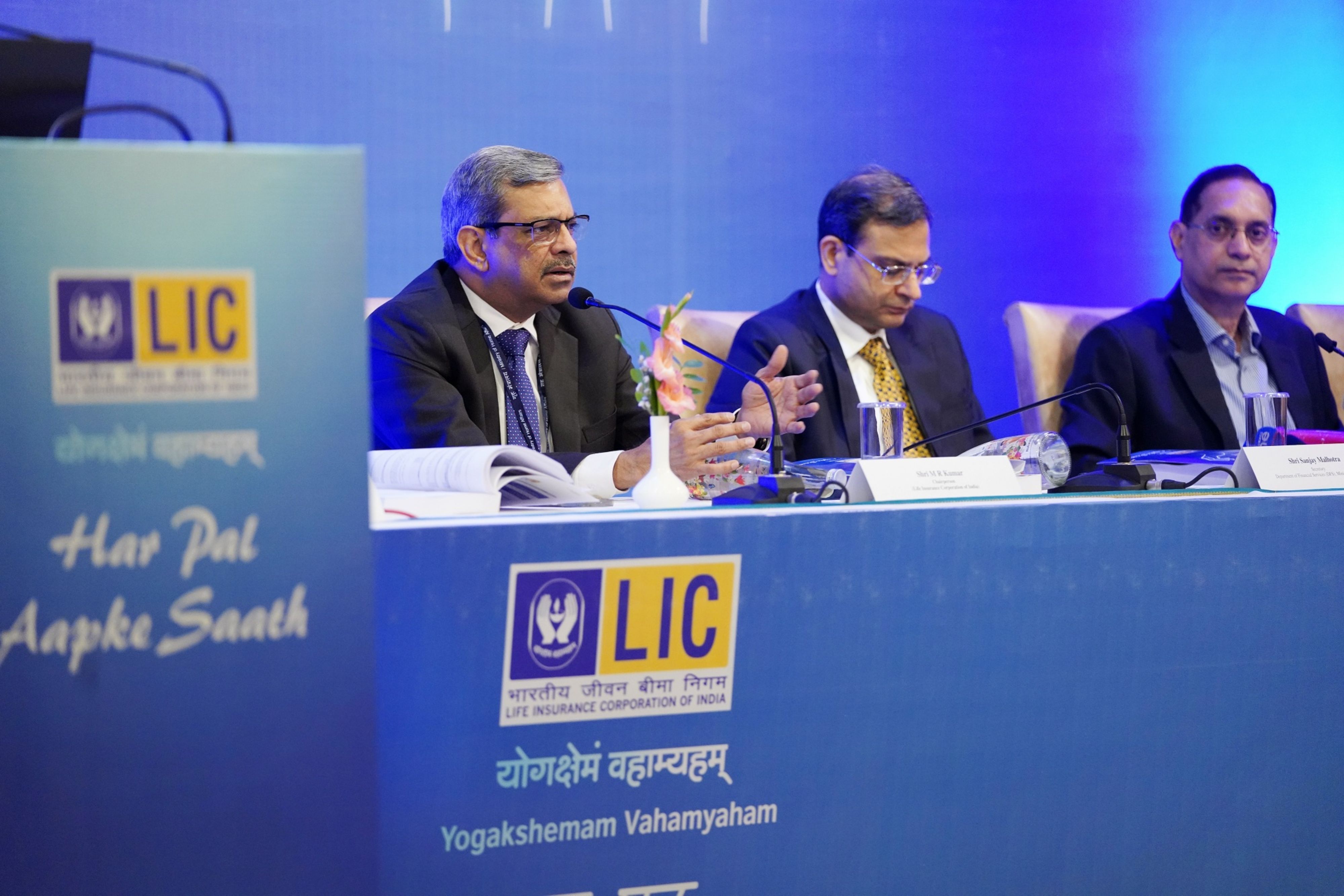 (From left) MR Kumar, chairman of LIC; Sanjay Malhotra, secretary of India's Department of Financial Services, and Tuhin Kanta Pandey, secretary of DIPAM, during a news conference in New Delhi. (Photographer: T. Narayan/Bloomberg)