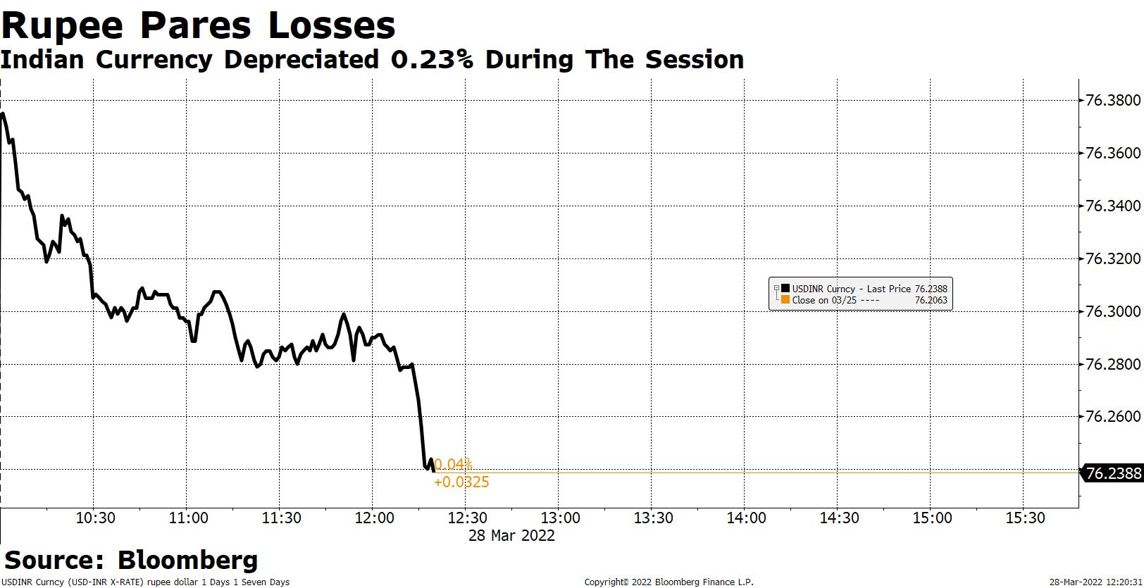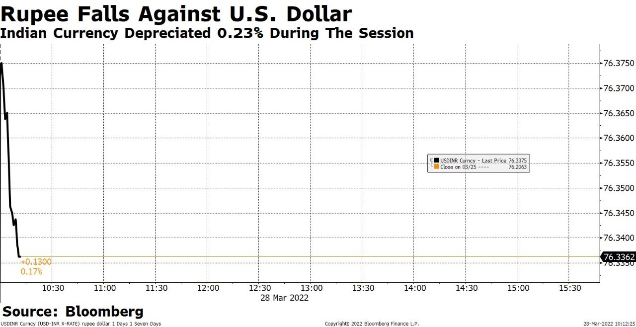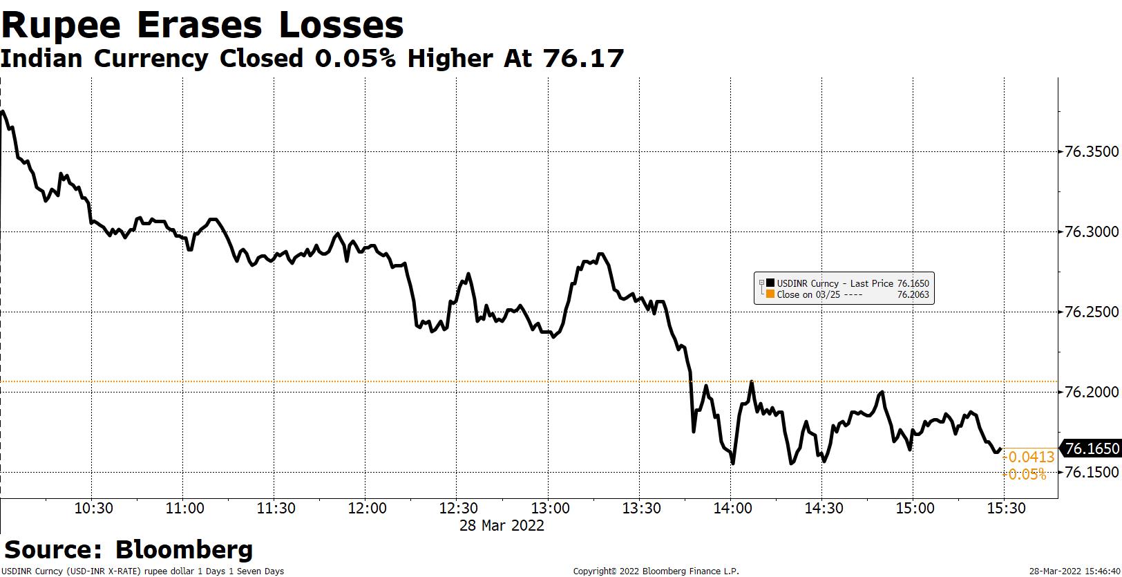 The Indian rupee ended 0.22% higher at 76.20 against the U.S. dollar on Friday on lower crude prices.