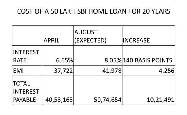 While the SBI is yet to pass on the August RBI hike to customers, see below a table explaining the change in the EMI for a 20-year home loan based on the expected increase.