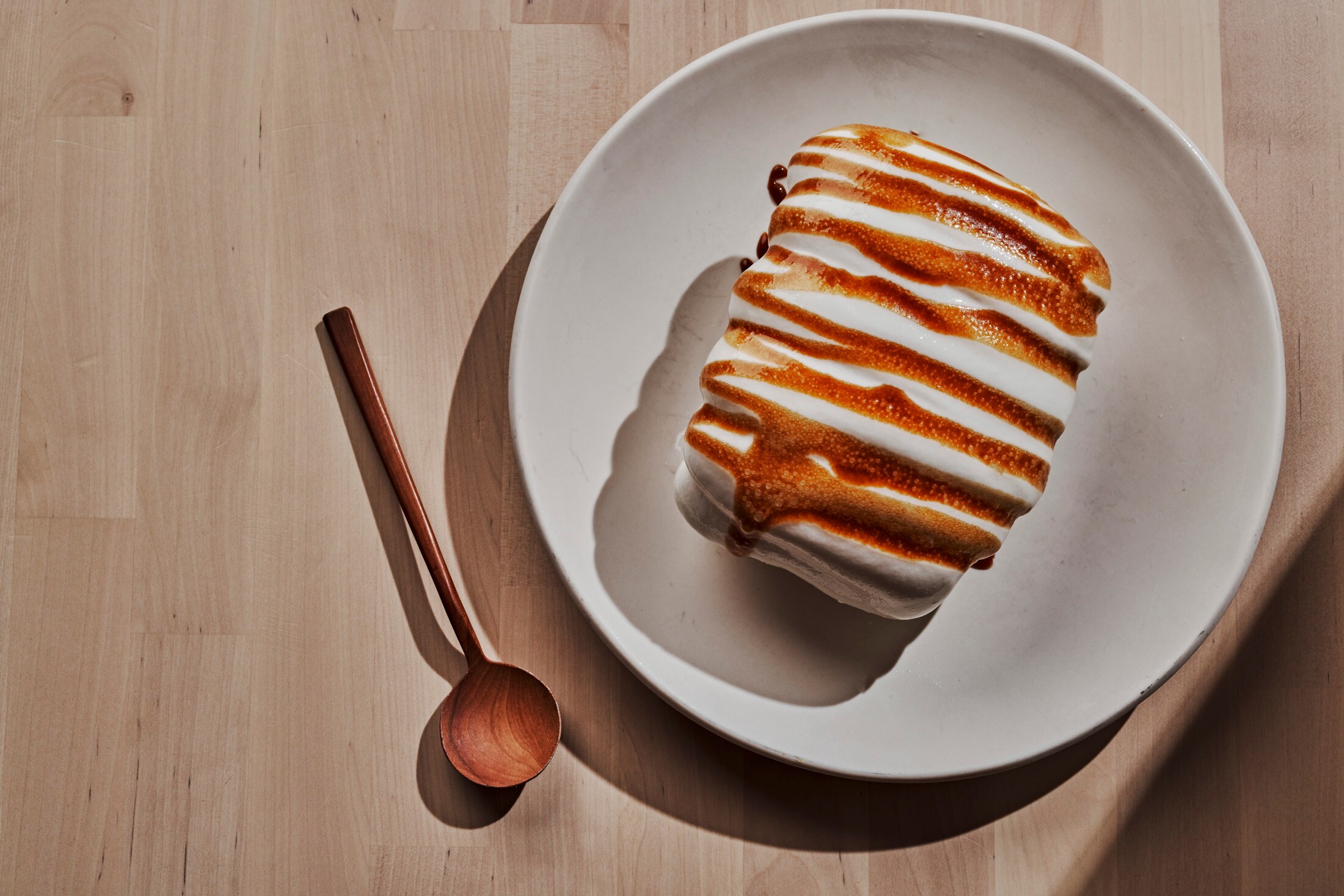 The second-most popular dish at Locust is a Japanese shaved ice dessert known as kakigori. Using a Swan ice shaver and blocks of crystal-clear cubes, Moran shapes square mounds of ice, layer upon layer, with house-made syrups and sauces. Options include a take on tea and biscuits and more unexpected flavor combinations such as marzipan mousse blanketing layers of passion fruit curd, crispy pastry pieces, whipped almond cream, and bergamot zest, all drizzled in salted caramel.