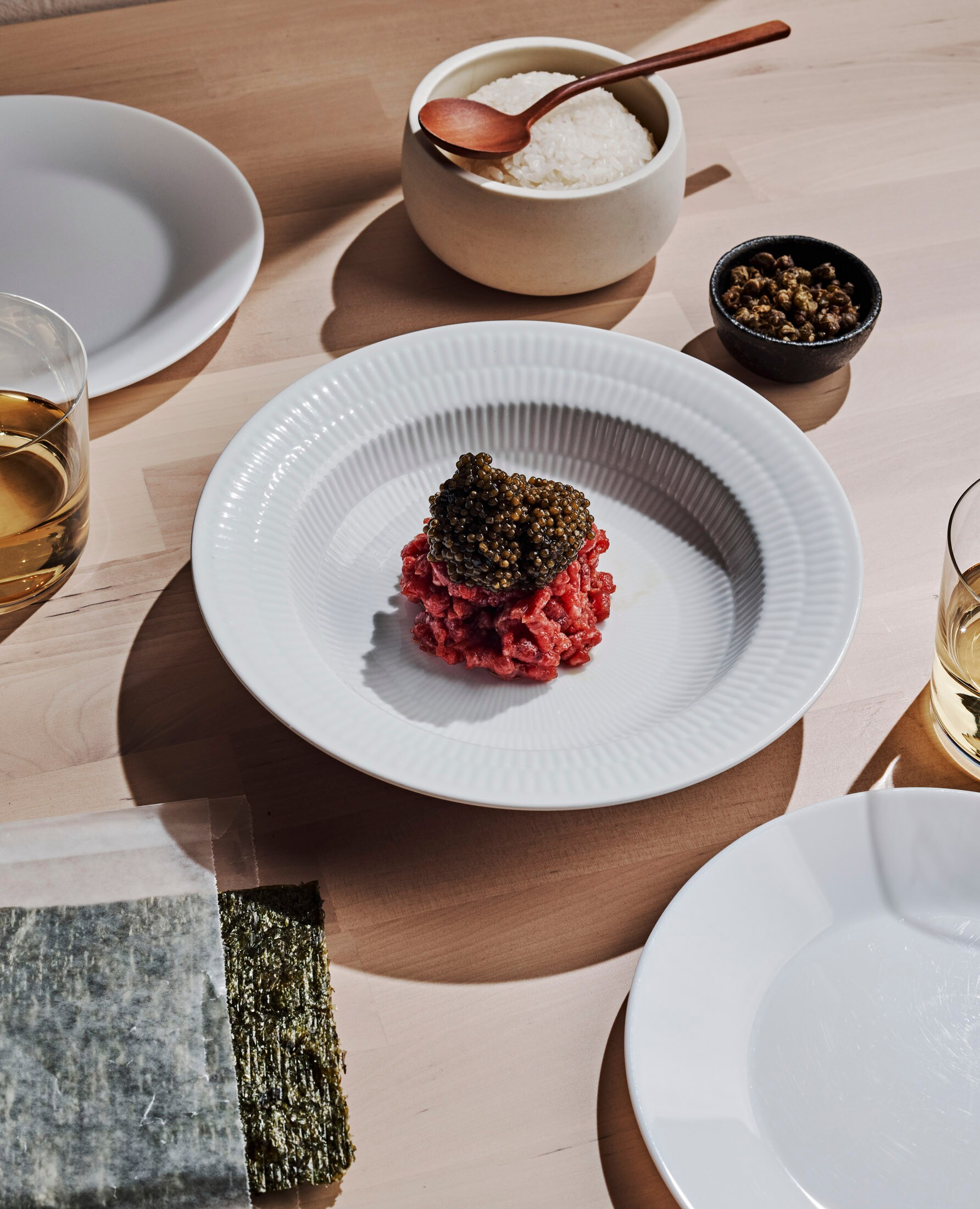 Beyond the dumplings, patrons can sample weekly specials such as fried shrimp mousse brushed with shrimp head oil and glazed in a sour-spicy chile sauce. There's also Moran's build-your-own beef tartare hand roll. It comes touched with horseradish oil, as well as steamed California-grown white rice, seasoned crispy rice, green onion, nori sheets, freeze-dried capers, and mayo made from smoked pickled eggs. Patrons can kick it up with ossetra caviar.