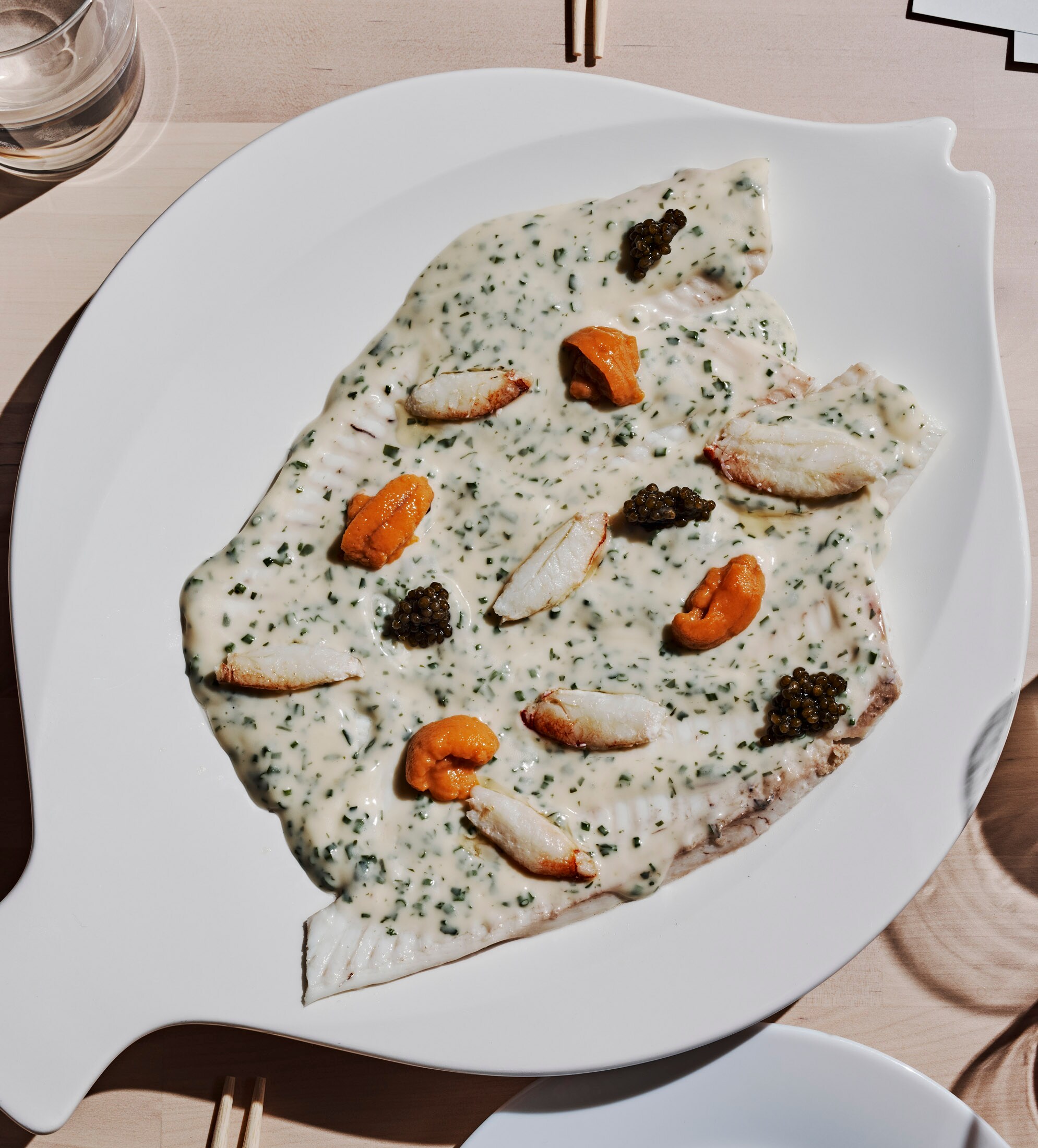Dover sole with seafood butter sauce features uni and more caviar.Photographer: Andrew Thomas Lee