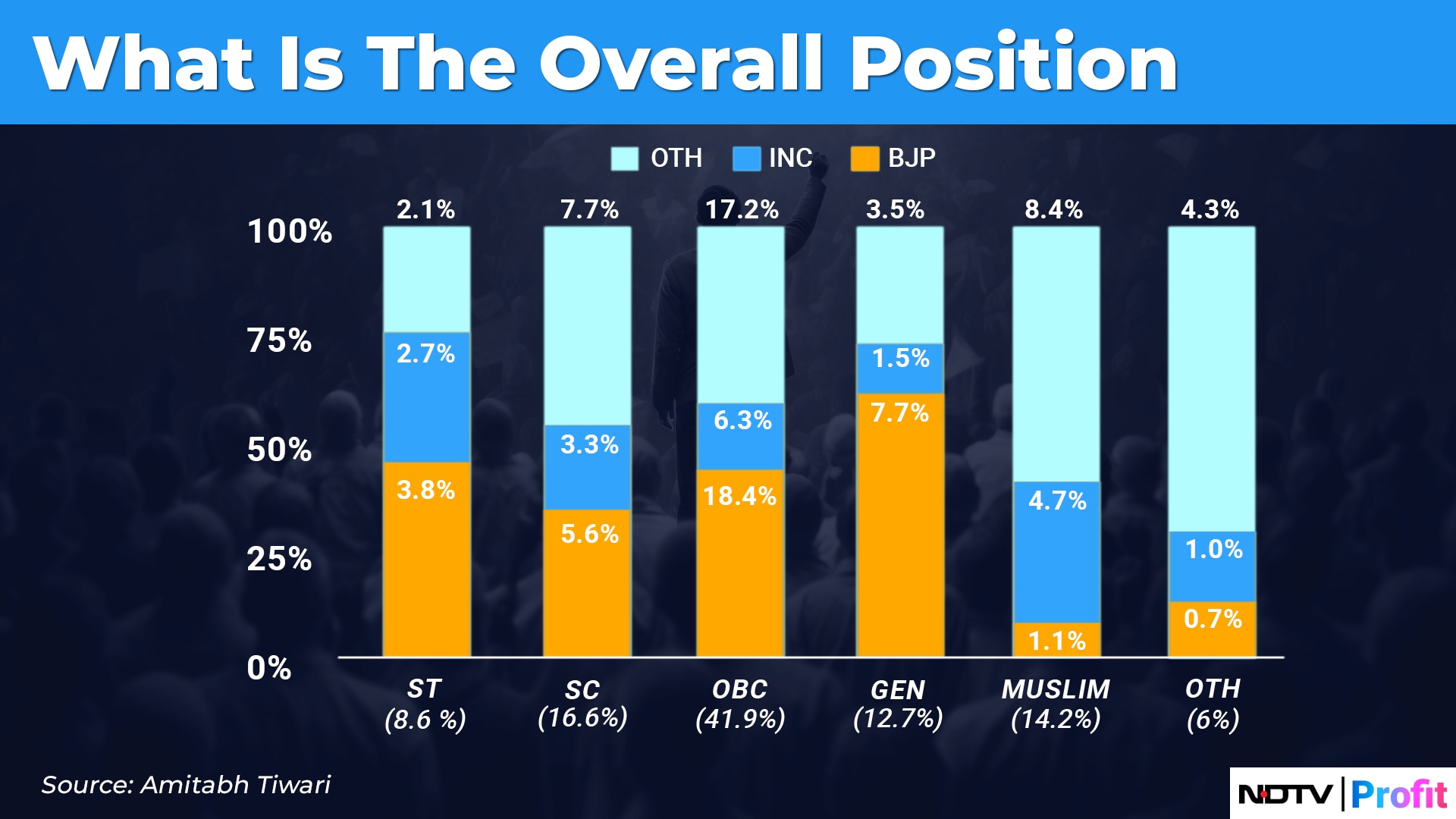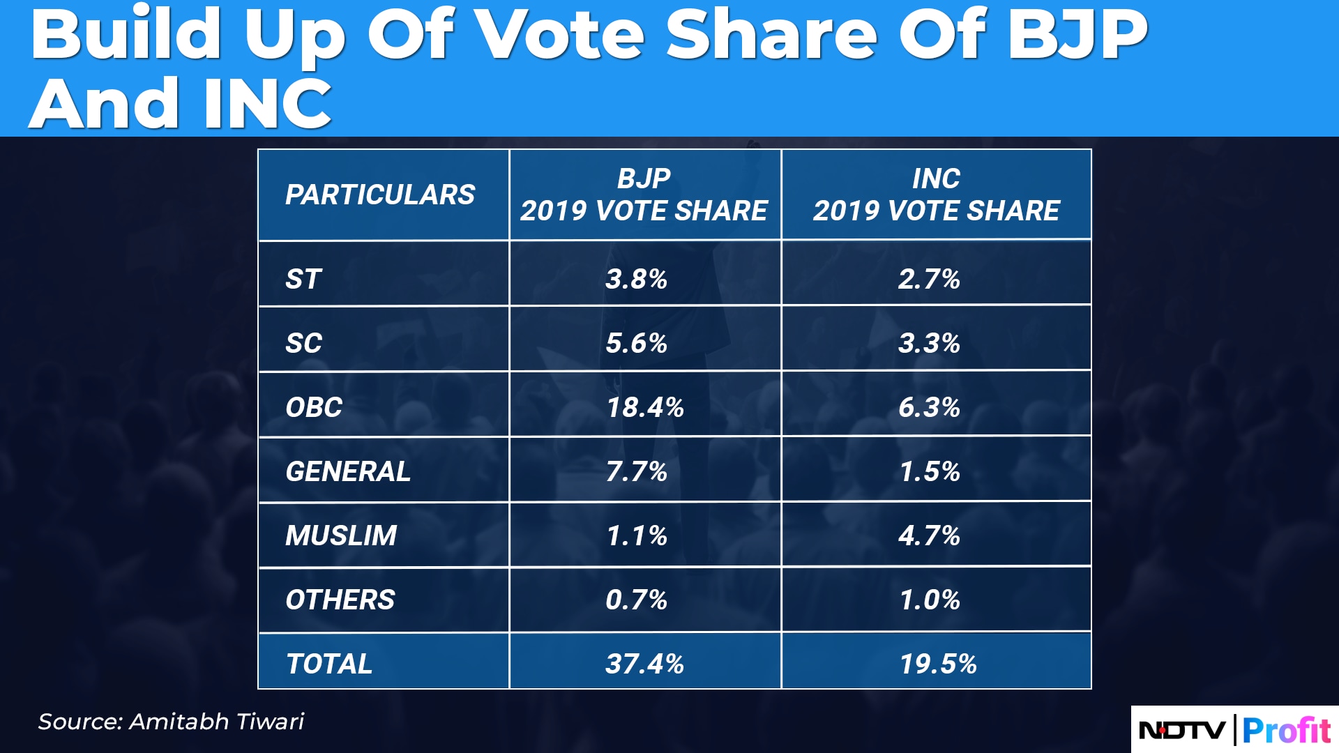 BJP got around 37.4% vote share in 2019. How did it get this vote share? It got 3.8% vote share from ST community, 5.6% from SC, 18.4% from OBC, 7.7% from general category, 1.1% from Muslims and 0.7% from others.