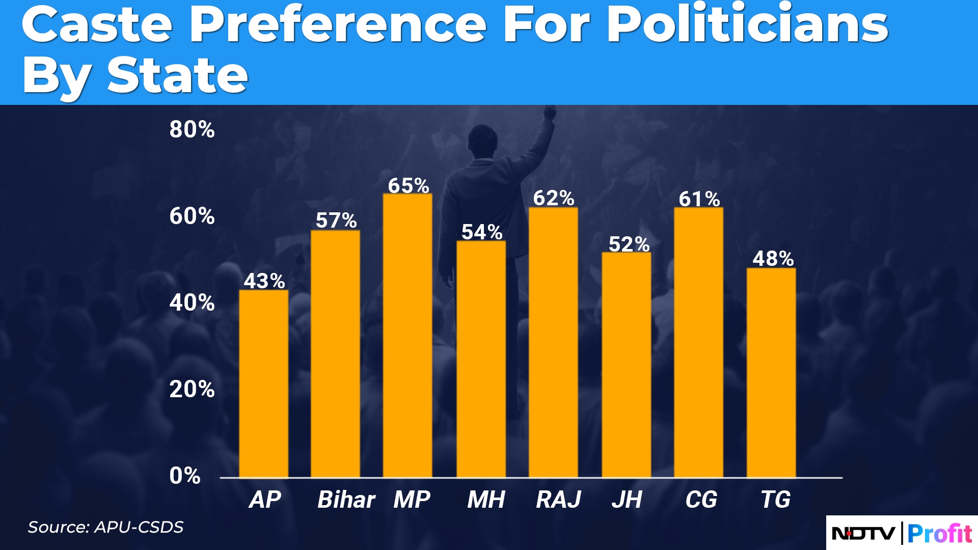 This indicates how identity politics plays a significant role in state and general elections. 43% in Andhra, 57% in Bihar, 65% in MP, 54% in Maharashtra, 62% in Rajasthan, 52% in Jharkhand, 61% in Chhattisgarh and 48% in Telangana prefer a political leader from their own caste and religion.