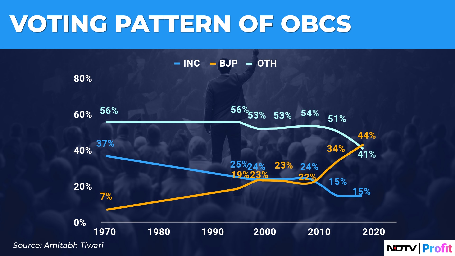 The OBC voters, which account for the highest population in the country, have shifted to BJP over the years, with double the support from 22% in 2009 to 44% in 2019. BJP has managed to somewhat blur the caste lines in its stronghold states, uniting various groups under its Hindutva umbrella. Its nationalism pitch plus labharthi model has also attracted voters, cutting across caste lines.