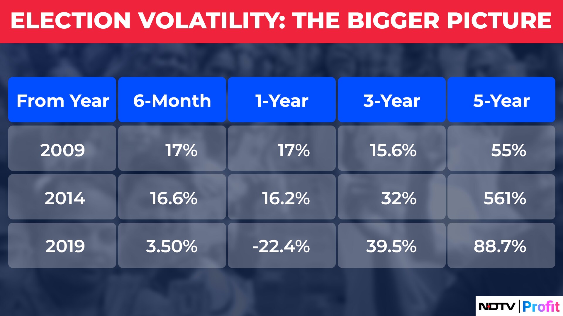 Picture this: The Nifty rose nearly 88% in the period between last Friday and the election results in 2019. If you had missed out on investing due to the volatility between April and May 2019, you would have missed out on this wealth-creating opportunity. In fact, if you had used the volatility and bought it around the 11,100 levels that the index touched in May 2019, then your returns would have been nearly 99%. And these returns would have occurred despite the loss in business during Covid-19. Similarly, while there was volatility in the earlier periods, the indices returned 55% and 56% in the subsequent five-year periods.