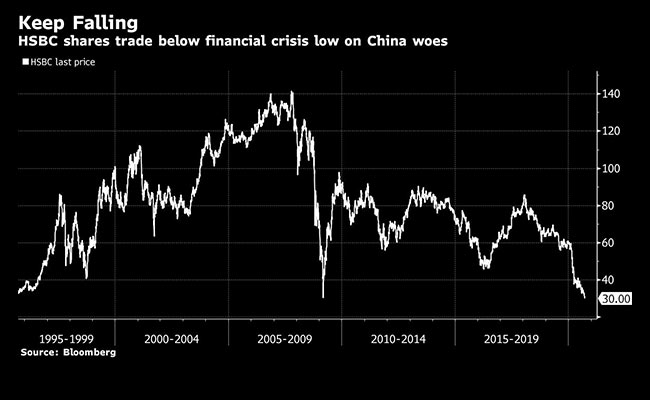 HSBC Holdings Plc slumped below its financial crisis low set more than a decade ago as pressures mount on several fronts, including a potential threat to its China expansion plans and increased scrutiny of money laundering controls.