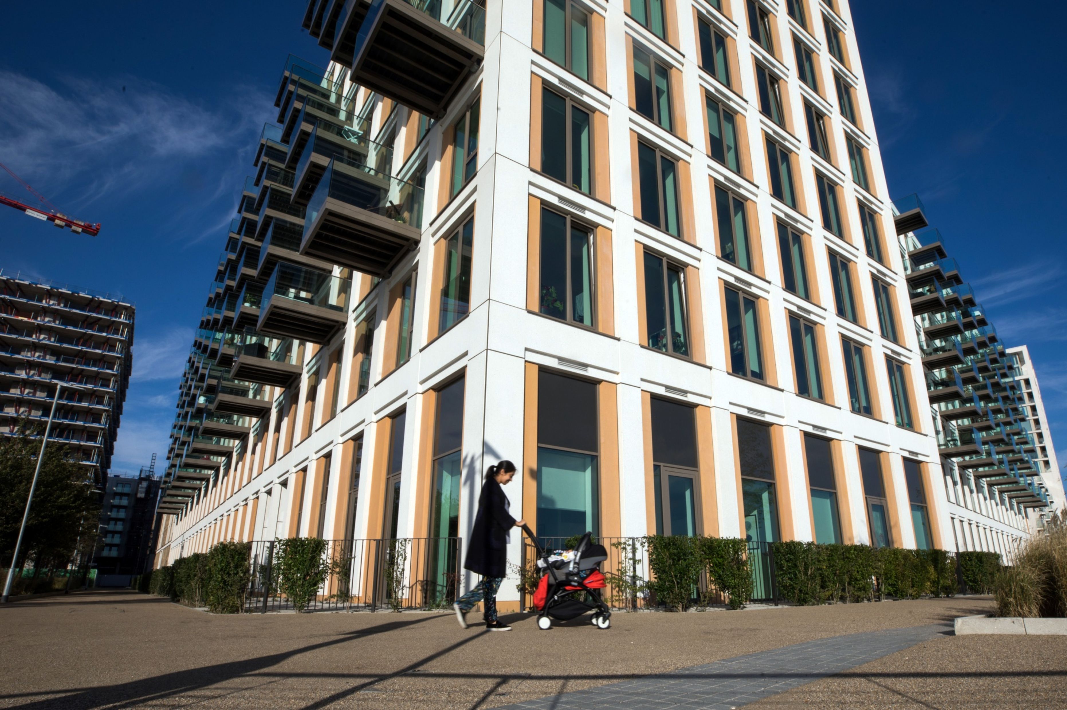 A pedestrian pushes a stroller past Laker House residential apartment block in the Royal Wharf development in London, U.K. (Photographer: Chris Ratcliffe/Bloomberg)