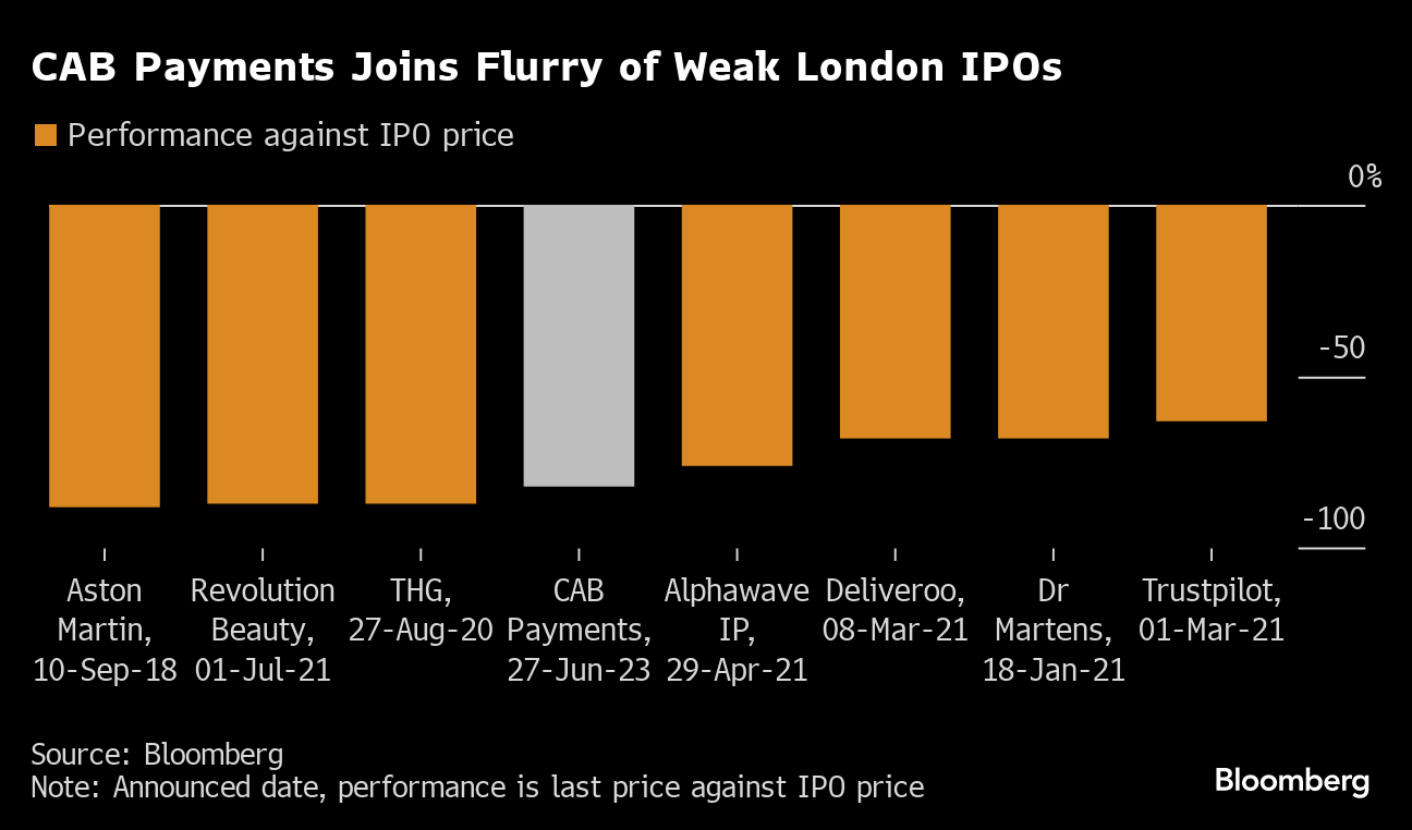 CAB Payments joins other high profile London IPOs — including Aston Martin Lagonda Global Holdings Plc, Deliveroo Plc and MyProtein.com owner THG Plc — that have plunged after going public. It's the latest blow to a UK capital market that has seen new listings all but dry up this year. Cambridge, England-based chip designer Arm Holdings Plc opted to sell shares last month in New York rather than London.
