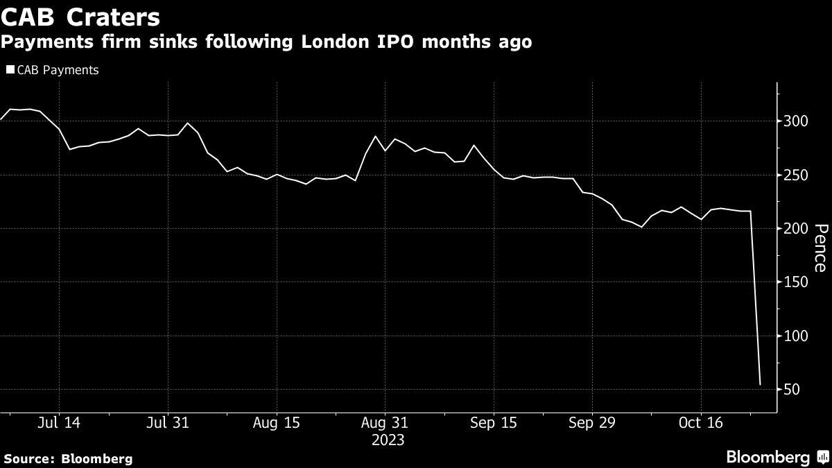 (Bloomberg) -- The troubles keep piling up for new London listings. A 75% plunge in shares of CAB Payments Holdings Ltd. on Tuesday means the processor of currency transactions now ranks as the world's worst major initial public offering this year.