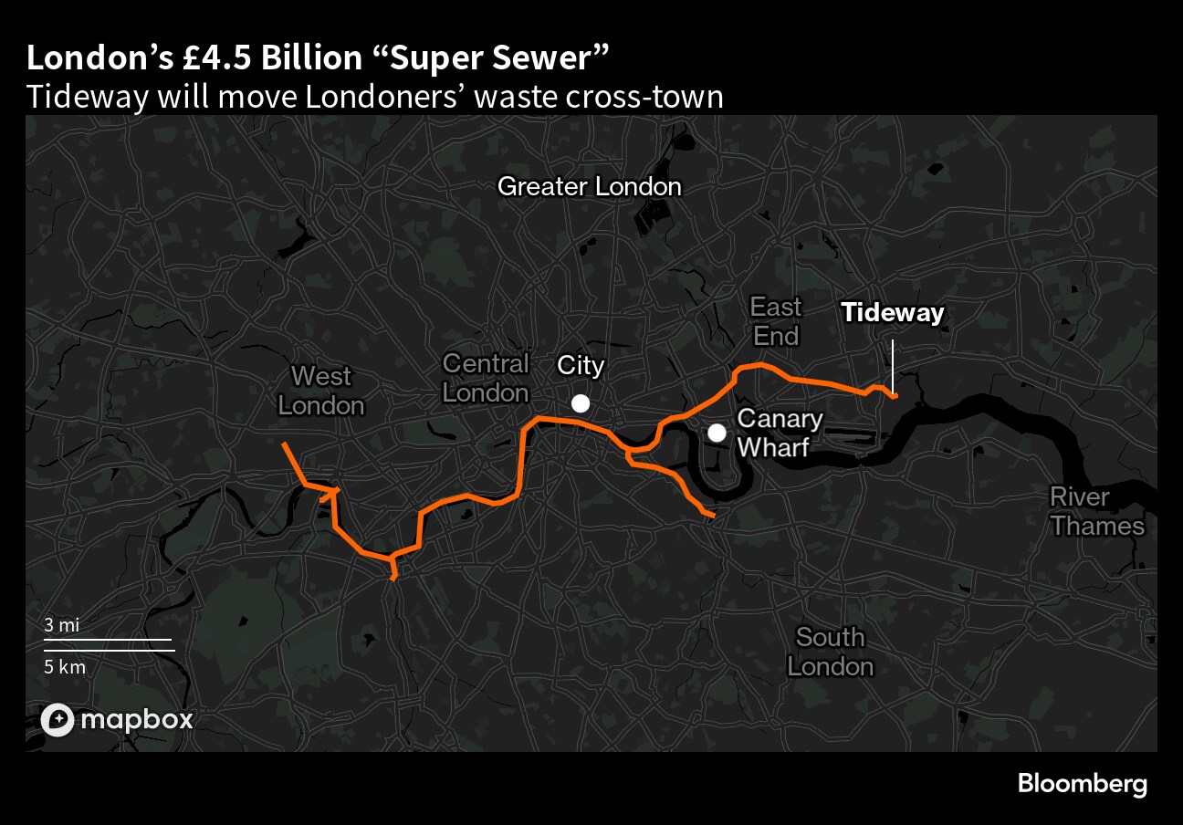 (Bloomberg) -- The journey into London's new sewer system begins with a safety briefing and a wardrobe change — a hard hat, goggles and gloves, steel-toe boots, high-visibility orange trousers and matching shirt. Then comes the 40-meter (131-foot) descent in what looks like a shark-diving cage dangling from a crane beside the yawning hole next to the River Thames.