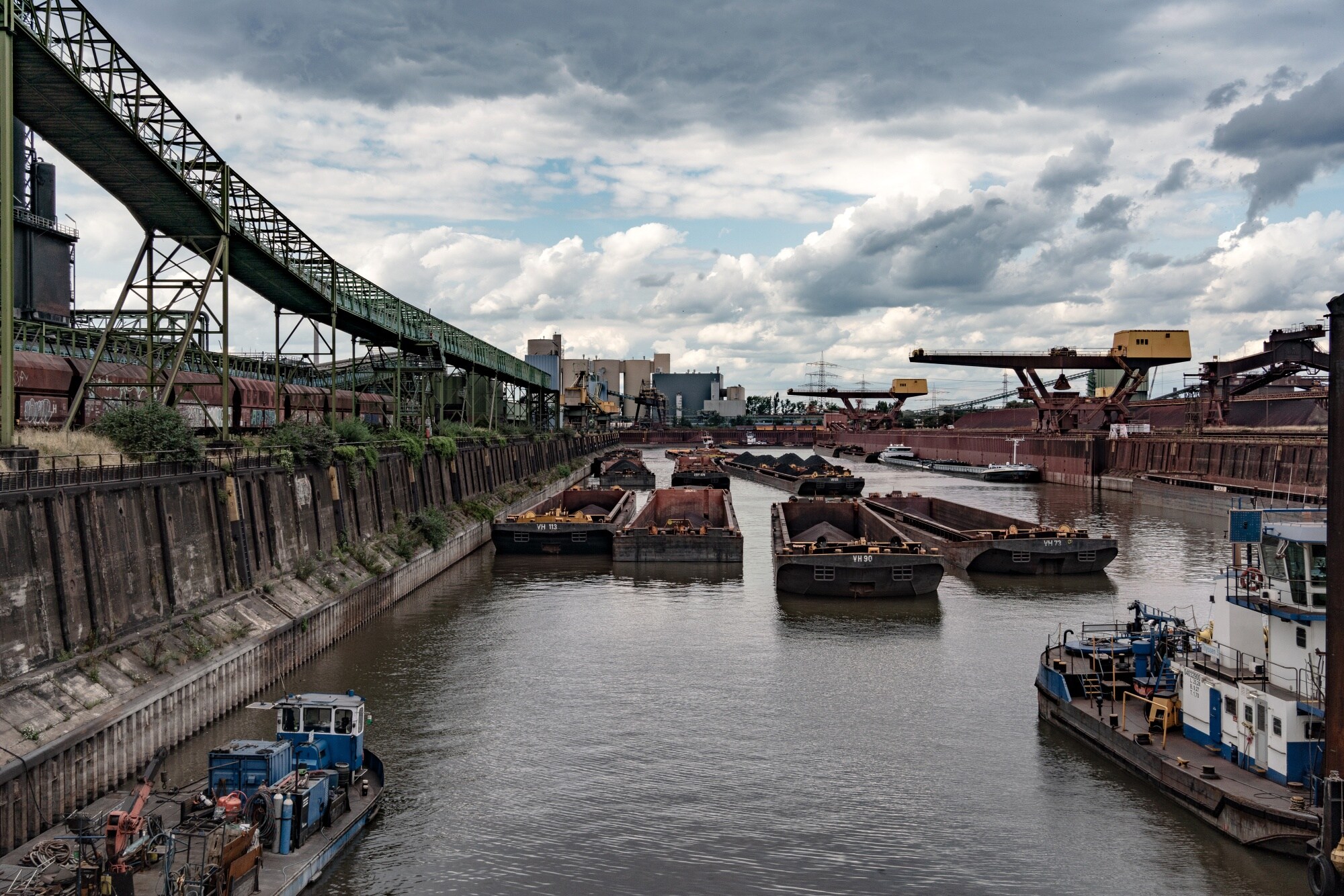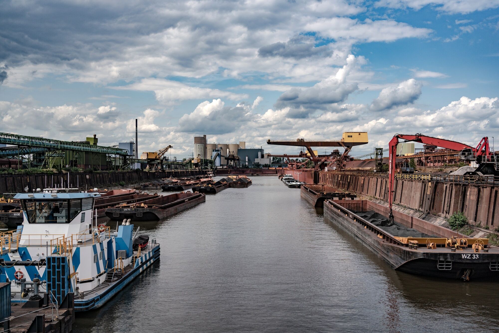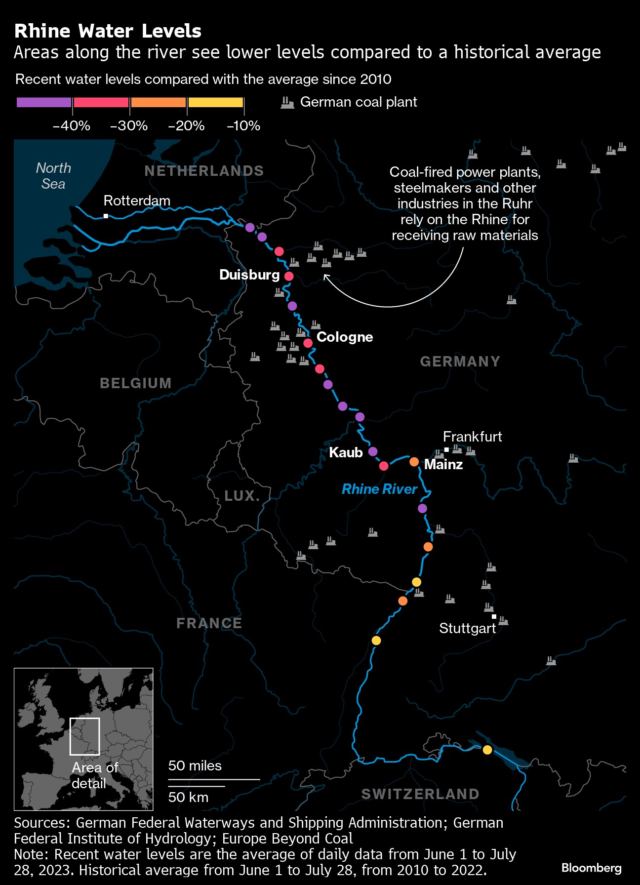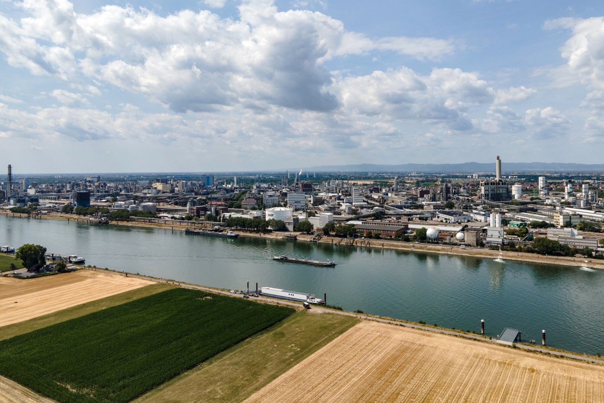 The river is largely irreplaceable for sites like BASF's sprawling facility in Ludwigshafen. The world's largest chemical plant — occupying 10 square kilometers along the river — loads and unloads about 15 barges a day, accounting for about 40% of its transport volume. BASF uses an early-warning system that predicts issues six weeks in advance. It's increasingly looking to shift transport to rail and is adding loading points to be more flexible.