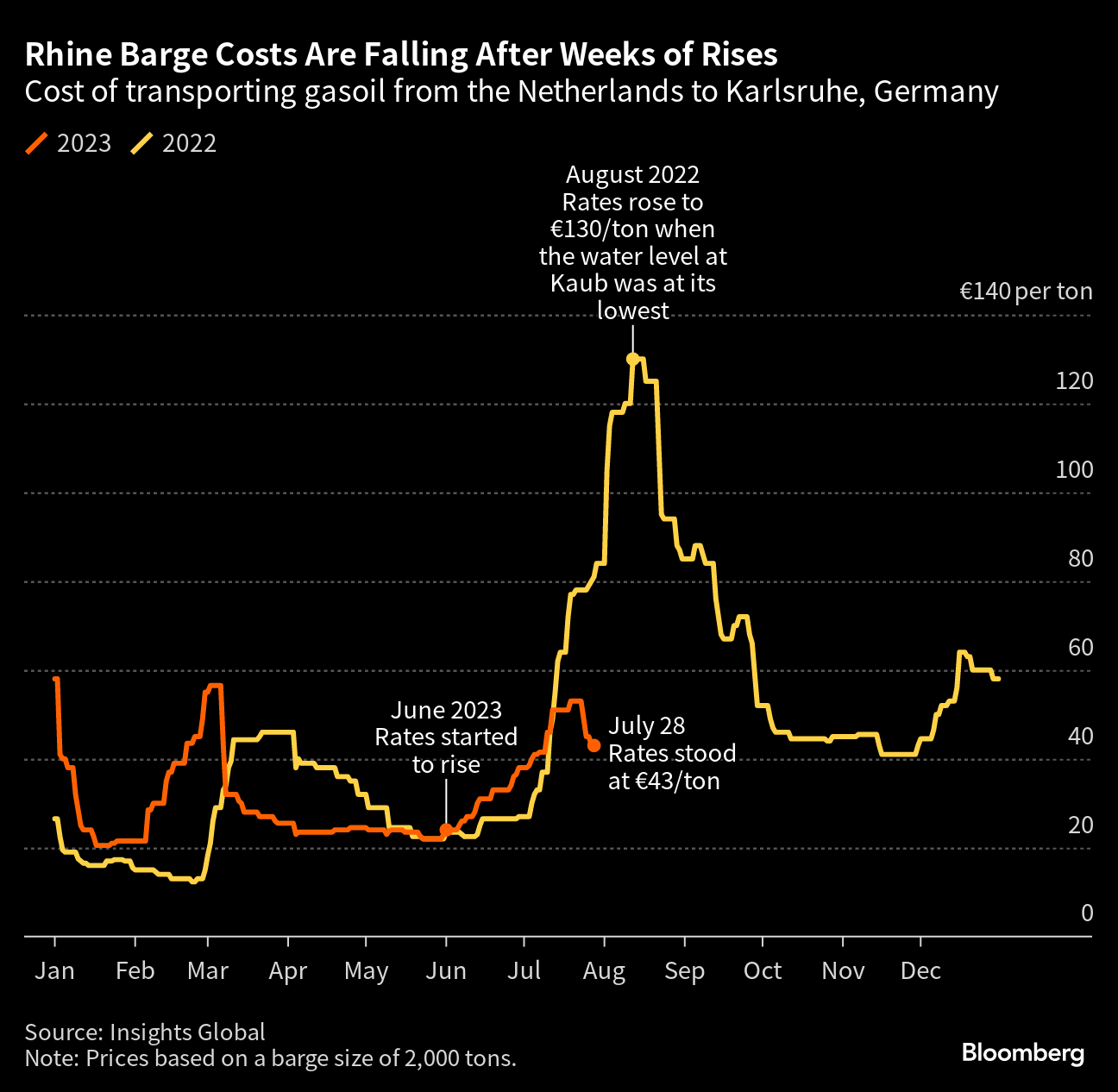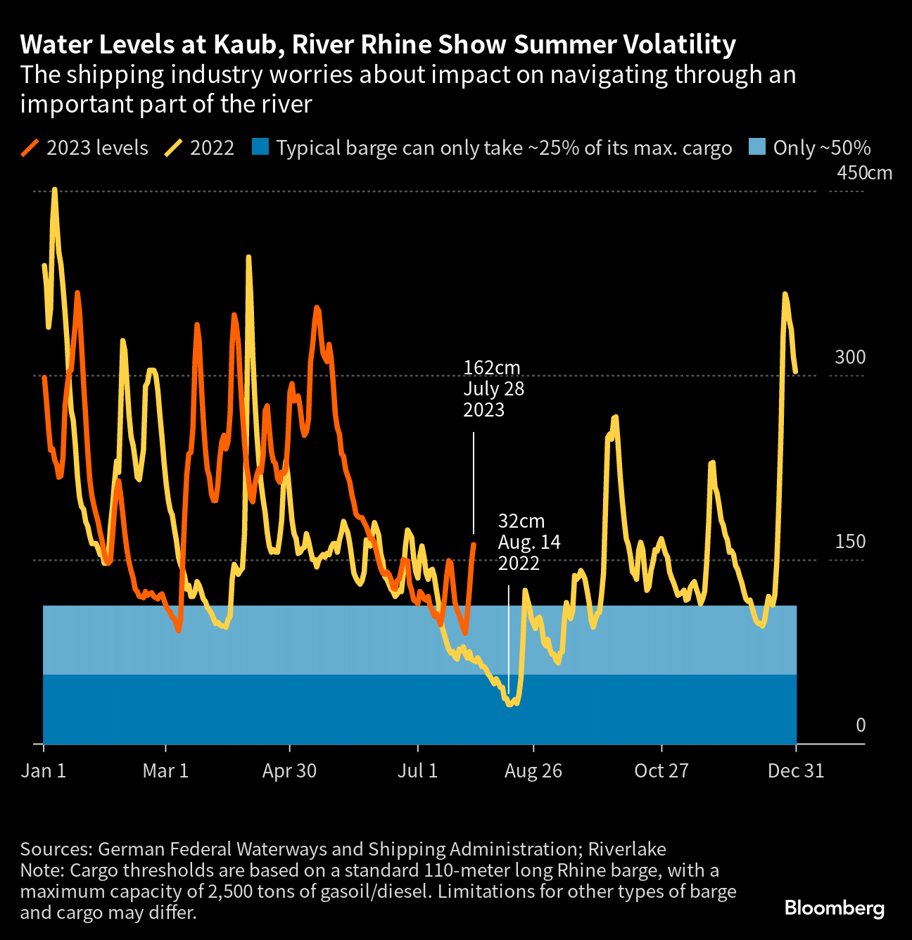 After brutal heat waves scorched southern Europe, the river at Kaub, a key waypoint west of Frankfurt, has hit levels this summer that mean some ships could carry only about half of normal capacity. While recent rains have eased the strain, even small changes can have a major impact. A drop of 10 centimeters (four inches) means about 100 fewer tons can be transported per ship, according to Florian Röthlingshöfer, director of Swiss Rhine Ports.