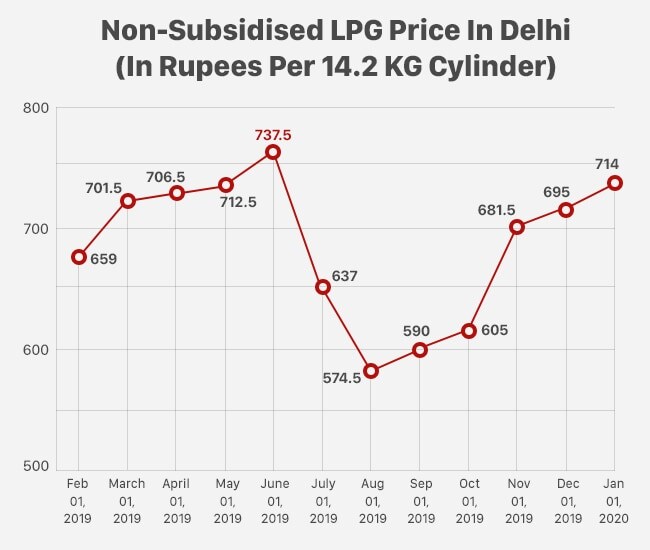 Non-subsidised LPG (liquefied petroleum gas) or cooking gas prices were increased with effect from January 1, 2020. That marked a fifth straight monthly hike in the prices. In Delhi and Mumbai, the hike was to the tune of Rs 19 and Rs 19.5 per cylinder respectively, according to Indian Oil Corporation, which supplies LPG under the Indane brand. With effect from January 1, the non-subsidised LPG rates were revised to Rs 714 per cylinder in Delhi and Rs 684.50 per cylinder in Mumbai. In December, the prices had stood at Rs 695 per cylinder and Rs 665 per cylinder respectively, according to Indian Oil's website - iocl.com.