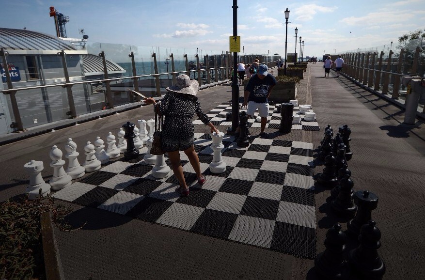 Tourists play a game of giant chess on the pier in Southend-on-sea, U.K. (Photographer: Chris Ratcliffe/Bloomberg)