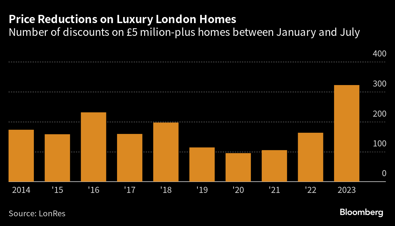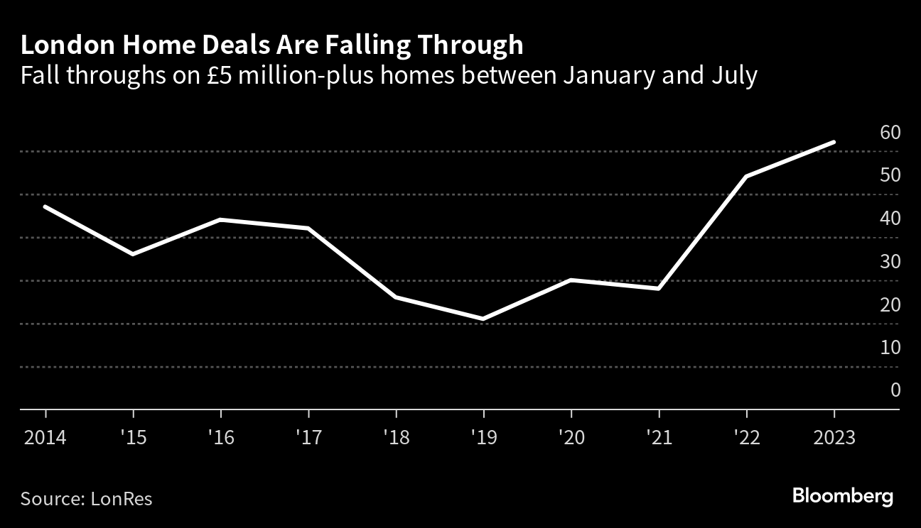That's causing more transactions to collapse in the capital, with the amount of £5 million-plus deals falling through rising 15% between January and July, compared with the same period a year earlier. What's more, the number of properties going under offer in July — billed as a leading sales indicator by LonRes — was about 14% lower than the same month in 2022, as high financing costs prompted some potential buyers to retreat.