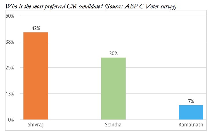 Elections in India are increasingly becoming Presidential-style. Chouhan is very popular among the masses in the state. Even the recent ABP-C Voter survey which predicted a Congress victory shows that Shivraj is leading the pack in the most-preferred CM candidate race. Even on a combined basis, Congress leaders are lagging behind Shivraj. Due to Chouhan's women-oriented schemes like Ladli Laxmi, Janani Suraksha, Kanya Vivah / Nikah, his popularity among women is higher than men.