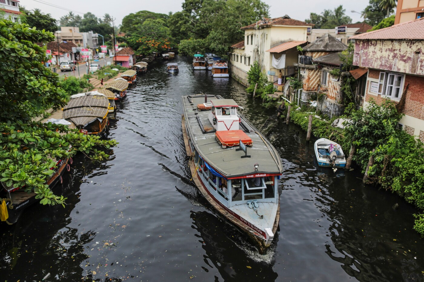 A ferry passes houseboats and residential buildings as it navigate the backwaters in Alappuzha, Kerala, India (Photographer: Dhiraj Singh/Bloomberg)